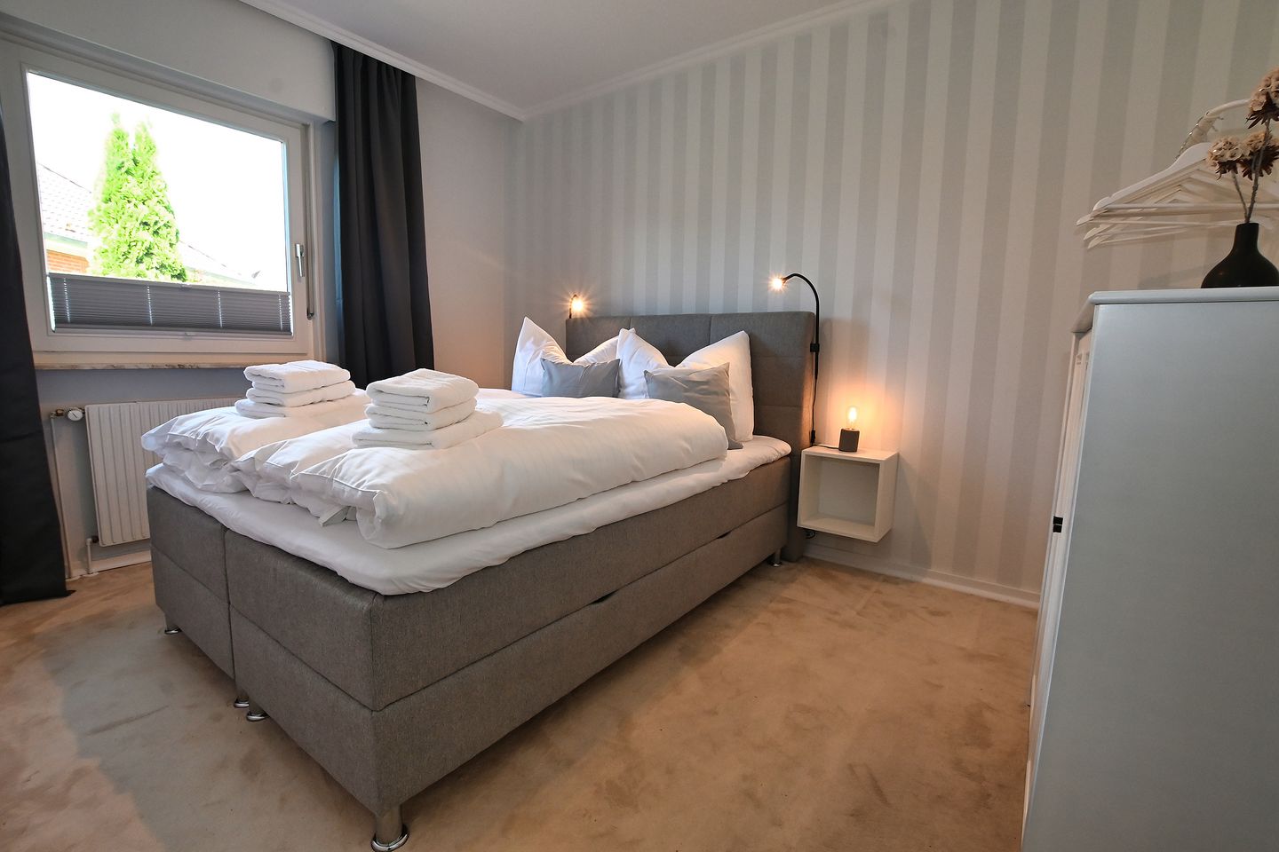 Die Wohnung verfügt über 3 separate Schlafzimmer, die mit Boxspringbetten ausgestattet sind. Die Betten haben eine Größe von 1,40 x 2,00 Meter & 1,60 x 2,00 Meter. Das Elternschlafzimmer verfügt über ein 1,80 x 2,00 Meter Bett.