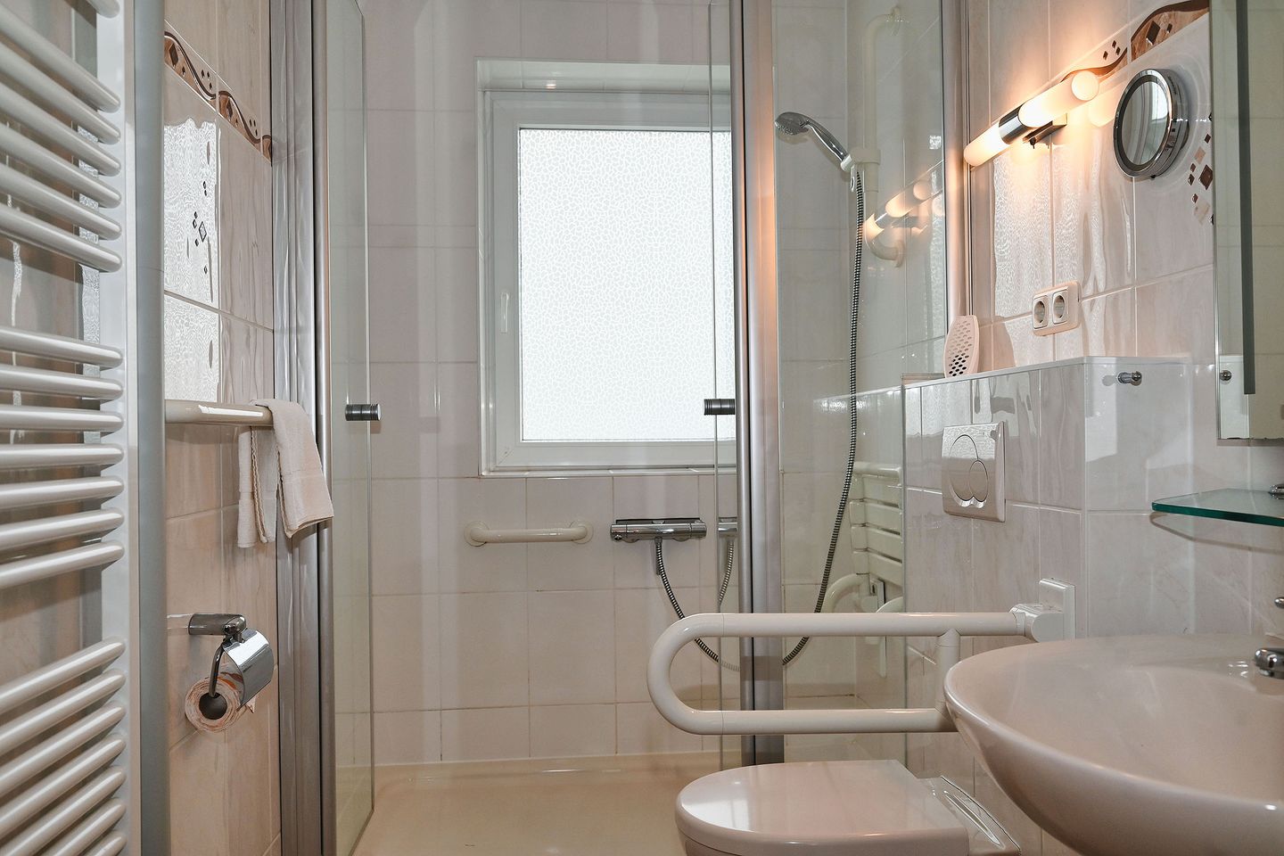 Ein modernes Badezimmer mit Dusche, Waschbecken, Fenster, Spiegel und Haartrockner rundet das komfortable Angebot ab.