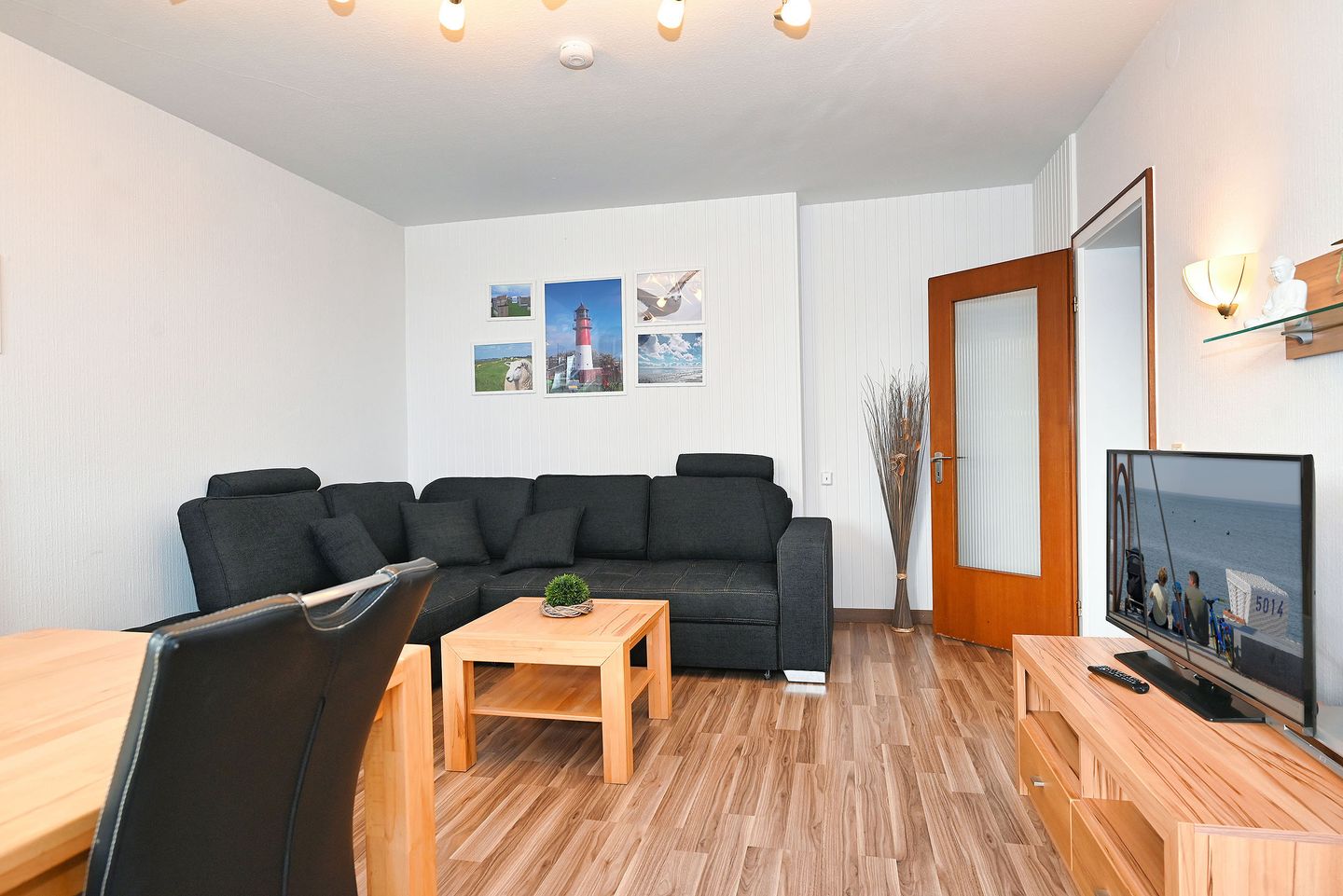 Der helle Wohnbereich bietet eine komfortable Sofaecke – ideal für entspannte Stunden mit der Familie oder zu zweit. Für Unterhaltung sorgen Fernseher, eine Spielekonsole, Radio sowie ein CD-Spieler.