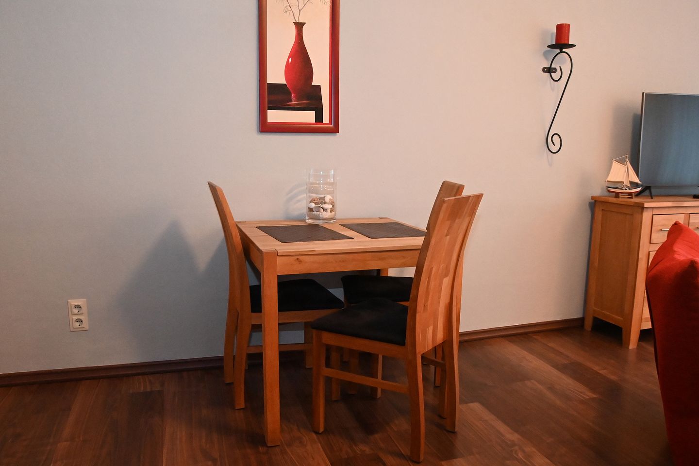 Die 1-Zimmer-Wohnung für 2 Personen, verfügt über ein Schrankbett, Sitzmöglichkeiten, eine einfache Küchenzeile und einen kleinen Balkon.