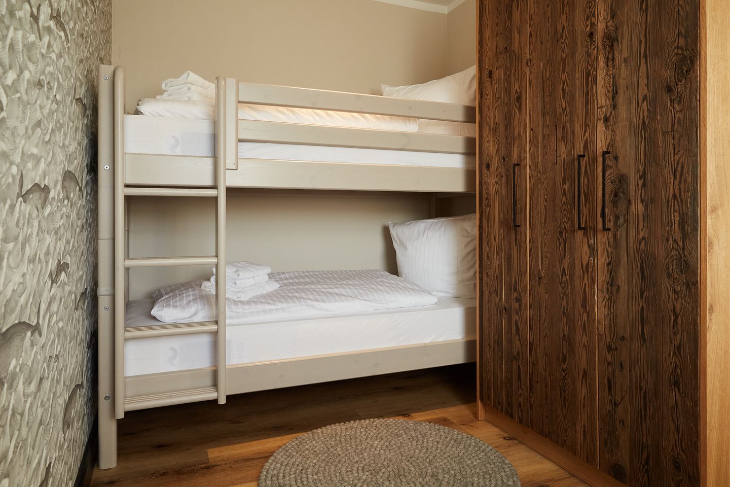 Hier warten zwei Schlafzimmer mit je einem komfortablen Doppelbett bzw. Hochbett und einem Smart-TV ausgestattet. Die moderne Küche ist offen zum Wohnzimmer ausgerichtet – hier finden Sie u. a. einen Induktionsherd, Spülmaschine und Backofen.