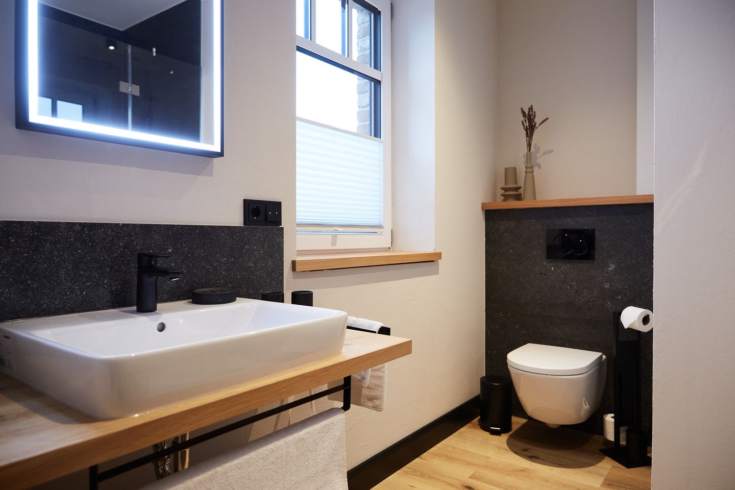 Auf rund 76 Quadratmetern finden vier Gäste Ihr kleines Urlaubsrefugium mit einer modernen und hochwertigen Ausstattung. Genießen Sie das entspannte Ambiente im lässigen Industrial Style, das gleichzeitig jede Menge Cozyness versprüht. Zusätzlich sorgen schallisolierte 3-fach verglaste Fenster und eine Fußbodenheizung für maximale Behaglichkeit.