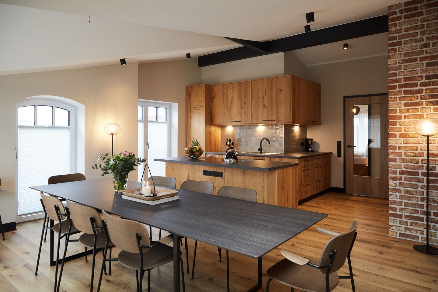 Die Ferienwohnungen sind zwischen 45 und 123 Quadratmetern groß und in sechs Kategorien eingeteilt – damit erfüllen sie jeden nur erdenklichen Urlaubsanspruch: Familien mit Kindern werden sich genauso wohl fühlen wie Paare oder Gruppen. Das hochwertige Interieur im Industrial Style versprüht jede Menge Cozyness. Wer mag, kommt sogar in den Genuss einer privaten Sauna. In einigen Apartments sind auch Haustiere erlaubt.