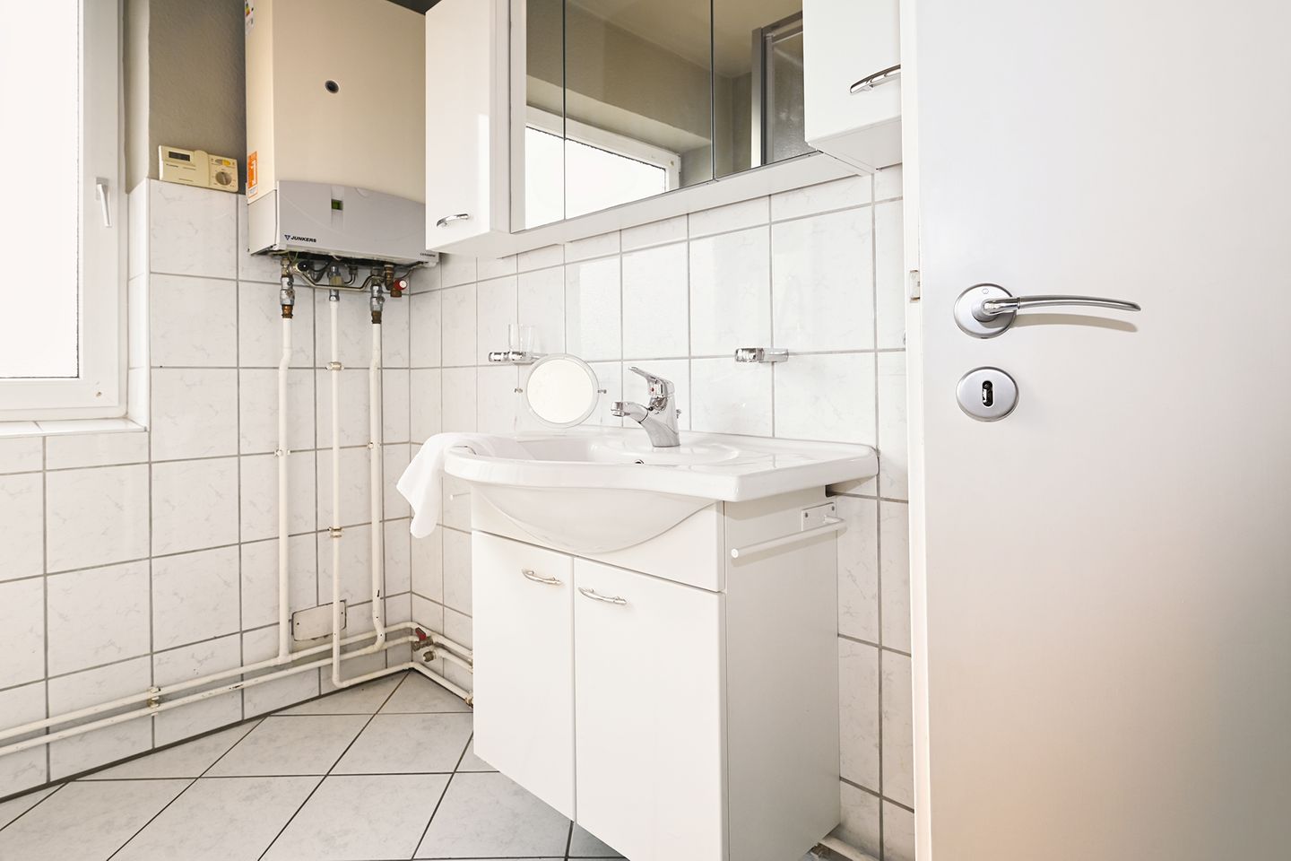 Im Badezimmer erwarten Sie eine Dusche, ein Spiegel sowie ein Fenster.