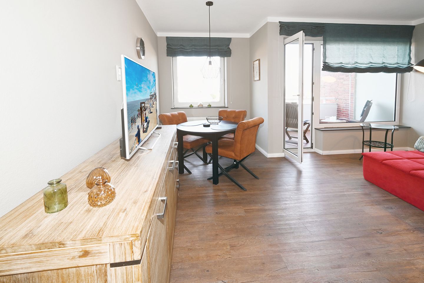 Der Wohnbereich ist mit Sofa und einem Fernseher ausgestattet und lädt nach einem Tag am Meer zum entspannten Ausklang ein.