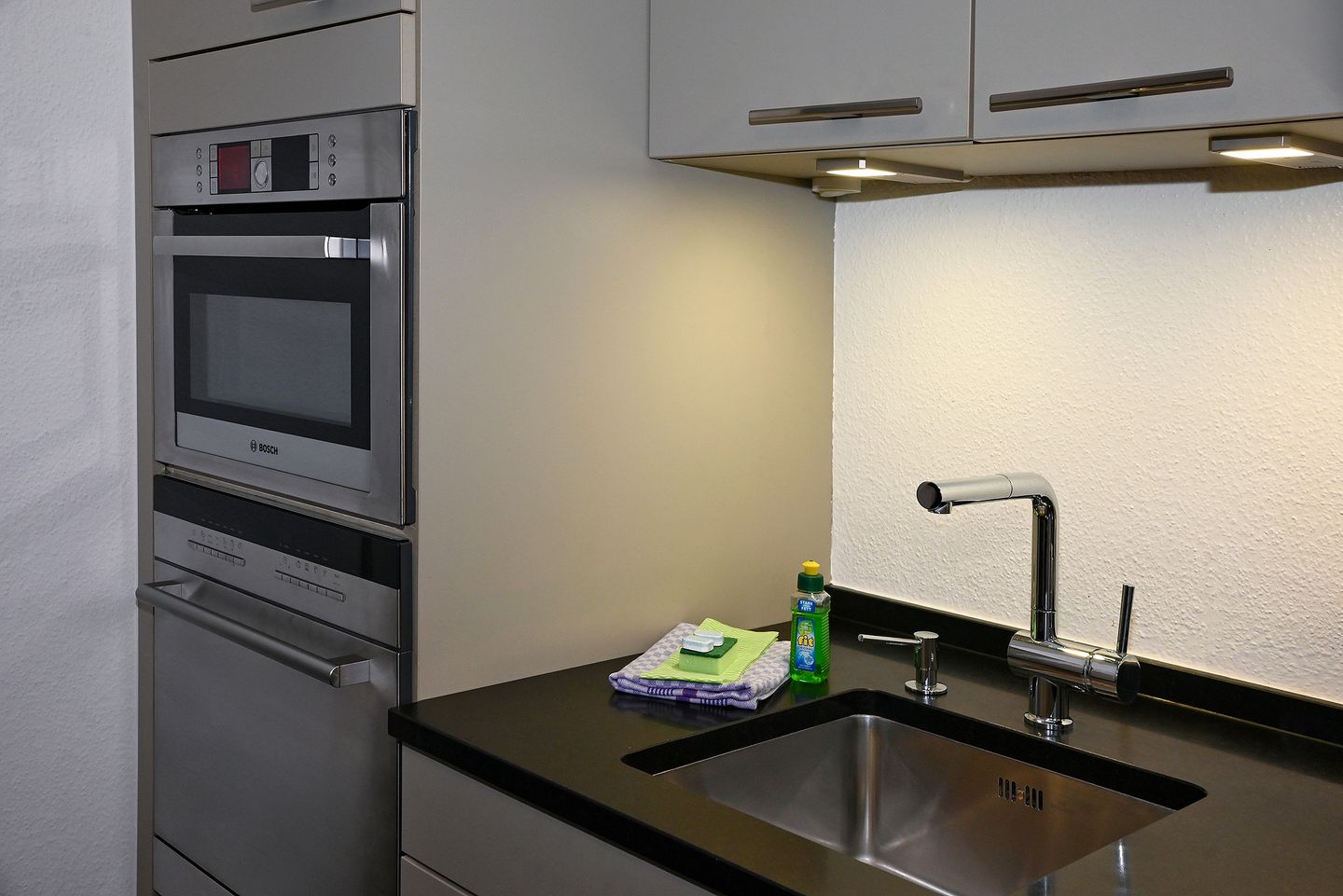 Im offen zum Wohnzimmer gestalteten Küchenbereich finden Sie eine umfangreiche Ausstattung: Neben einem Ceranherd, Backofen und einer Spülmaschine stehen Ihnen Mikrowelle, Wasserkocher und eine Kaffeemaschine zur Verfügung. Der angrenzende Essbereich mit Esstisch lädt zu gemeinsamen Mahlzeiten ein.