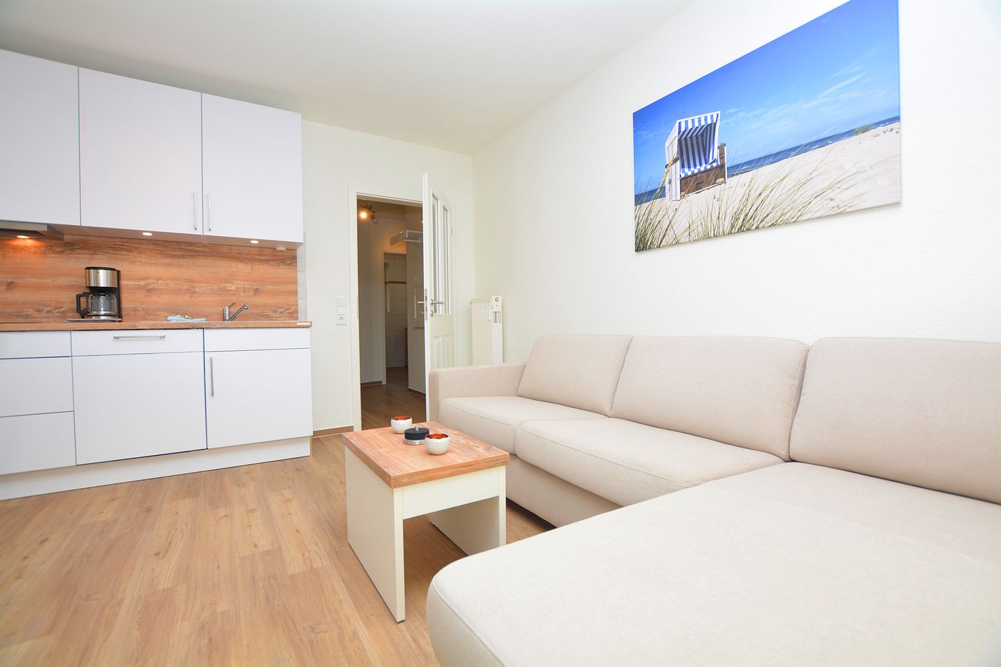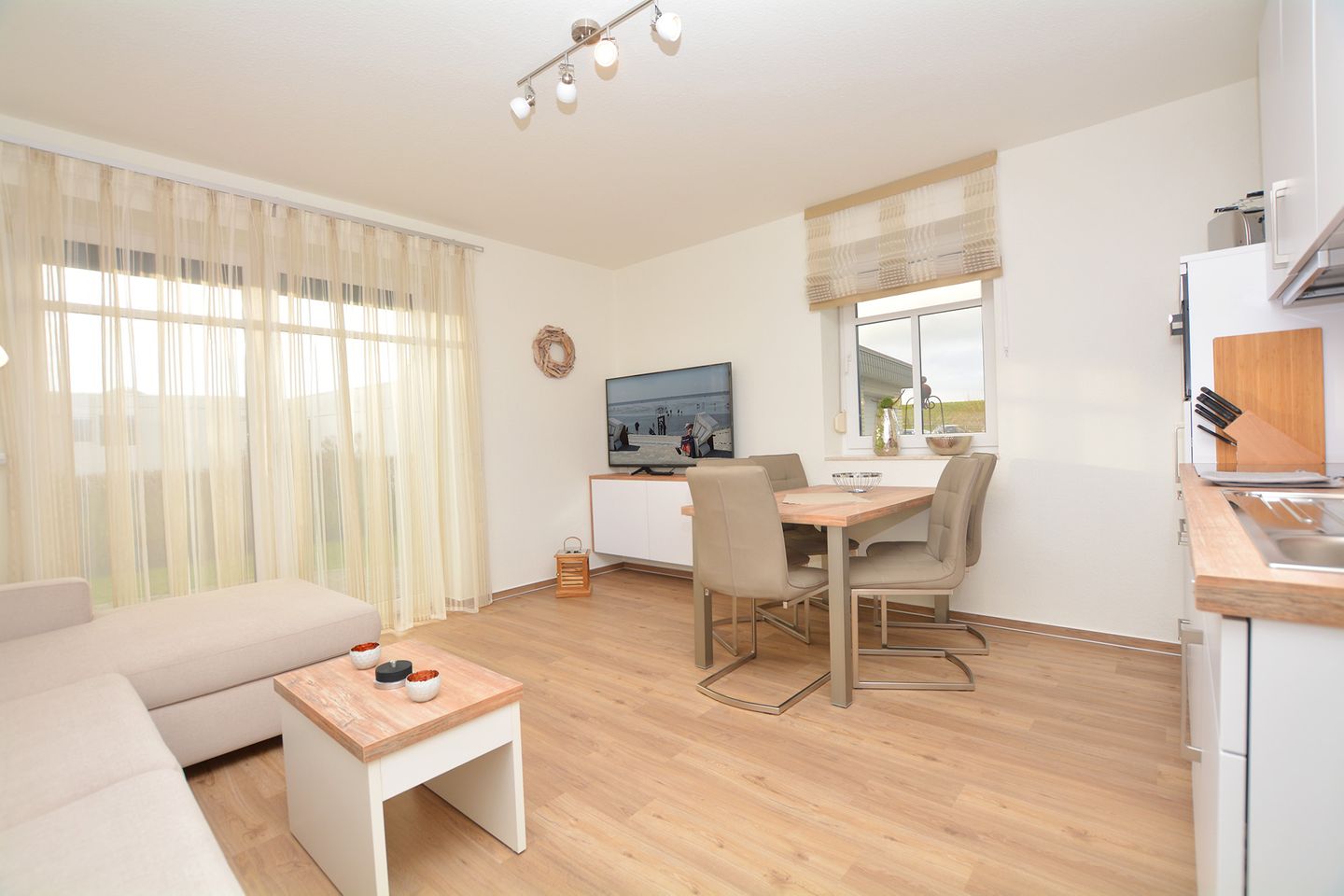 Die Ferienwohnung verfügt über zwei stilvolle Schlafzimmer, die eine ruhige Nachtruhe garantieren. Im offenen Wohnbereich erwartet Sie eine gemütliche Sofaecke sowie ein Esstisch, an dem Sie gemeinsam speisen können. Die große Fensterfront sorgt für viel Licht und eröffnet Ihnen einen wunderbaren Blick in den Garten, der zum Entspannen einlädt. Die Wohnung ist Nichtraucherfreundlich und liebevoll eingerichtet, damit Sie sich sofort wohlfühlen. Bei der zusätzlichen Schlafmöglichkeit handelt es sich um ein Schlafsofa.