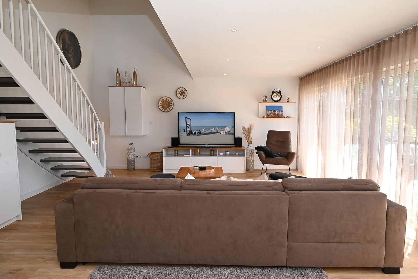 Der offene Wohnbereich verbindet die voll ausgestattete Küche mit dem Essbereich und dem gemütlichen Wohnzimmer. Die moderne Küche beinhaltet alles, was Sie benötigen – vom Herd über die Mikrowelle bis zur Spülmaschine. Hier können Sie Ihre Lieblingsgerichte zubereiten und gesellige Abende am großen Esstisch verbringen. Der Wohnbereich lädt zudem mit komfortablen Sofas, einem Sessel und einem Flachbild-TV dazu ein, nach einem erlebnisreichen Tag zu entspannen. Dank der HiFi-Anlage und dem kostenfreien WLAN bleiben Sie stets gut unterhalten und vernetzt. Bei der zusätzlichen Schlafmöglichkeit handelt es sich um ein Schlafsofa.