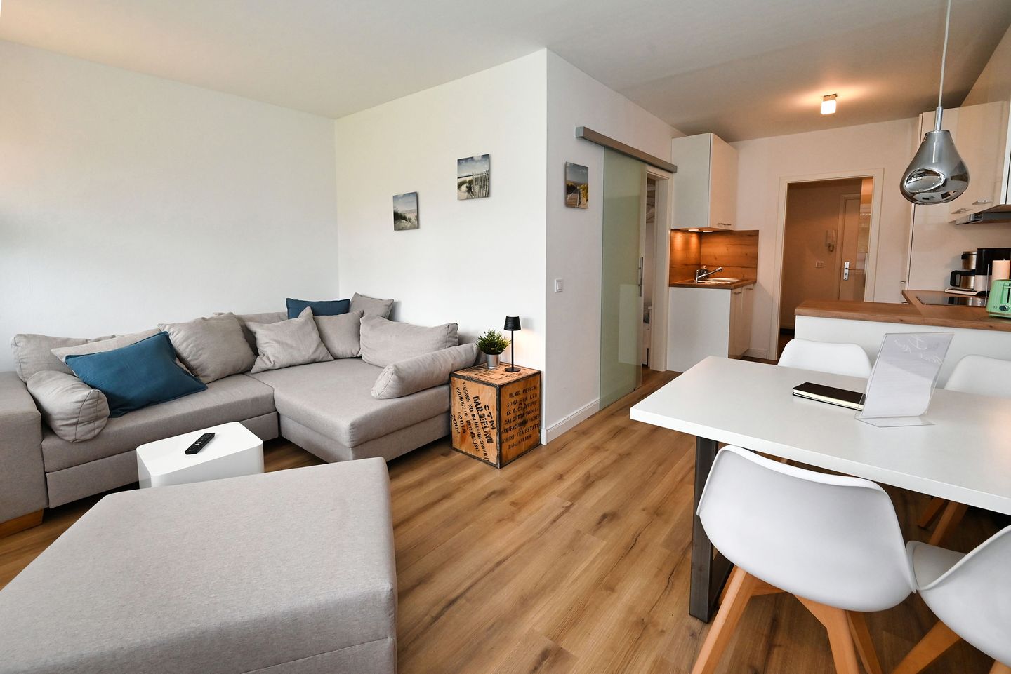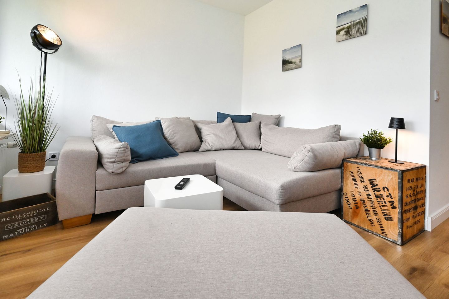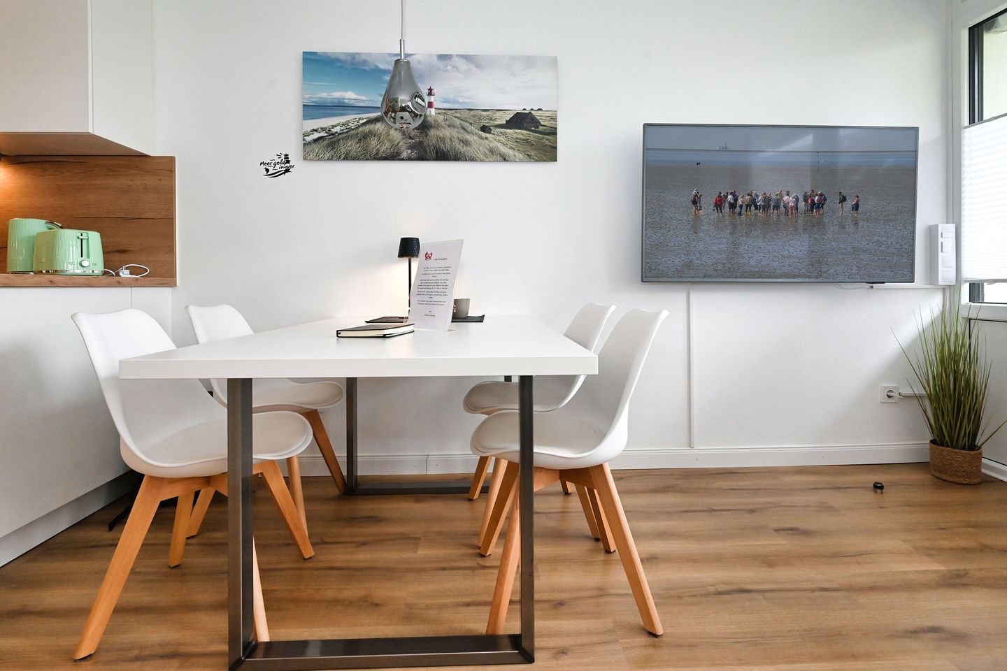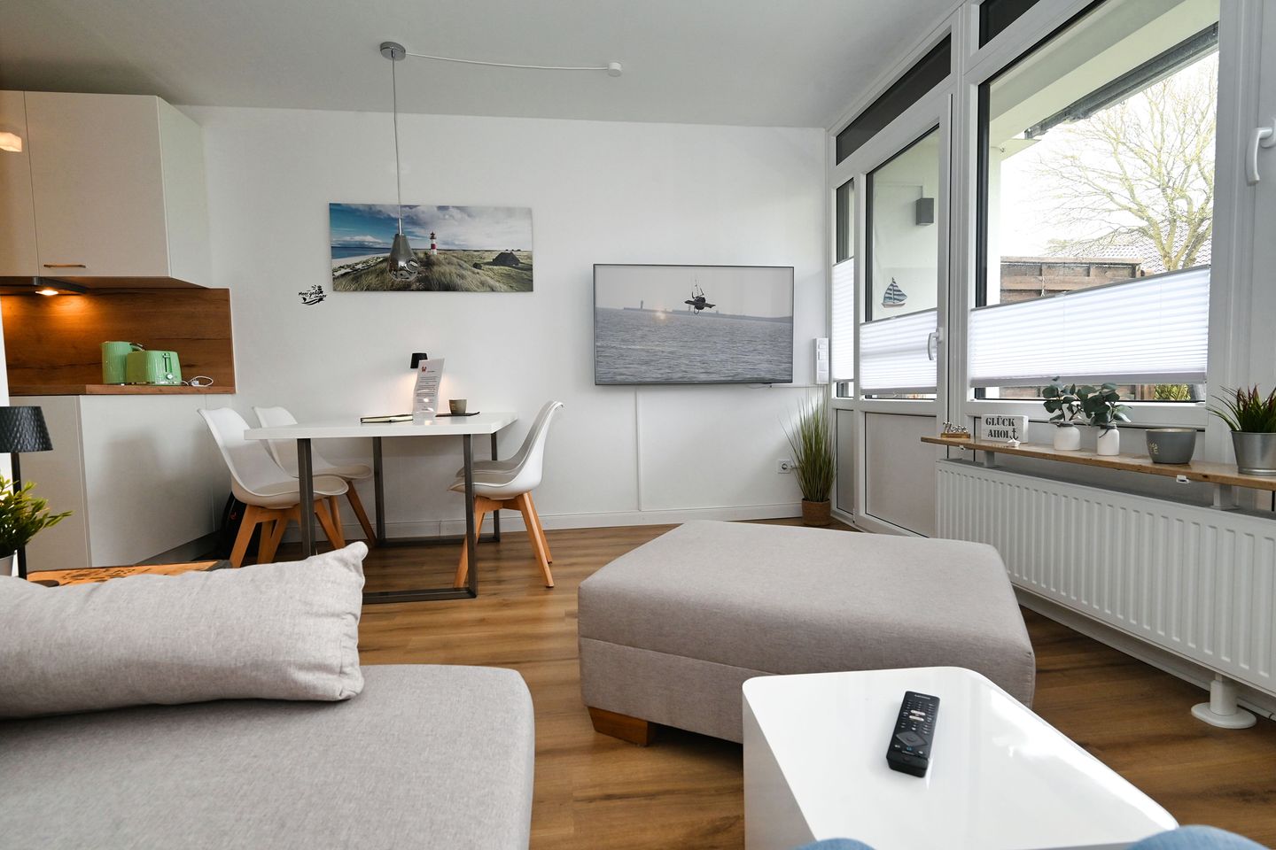 Im Wohnbereich erwartet Sie ein gemütliches Sofa, welches als Schlafsofa für die dritte Person vorgesehen ist, sowie ein moderner Smart TV für entspannte Stunden nach einem Tag an der frischen Nordseeluft.