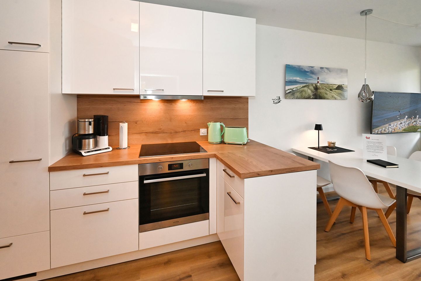 Der helle und offene Wohn-, Ess- und Kochbereich lädt zum Entspannen und Genießen ein. In der neuen Küche finden Sie alles, was Sie für die Zubereitung Ihrer