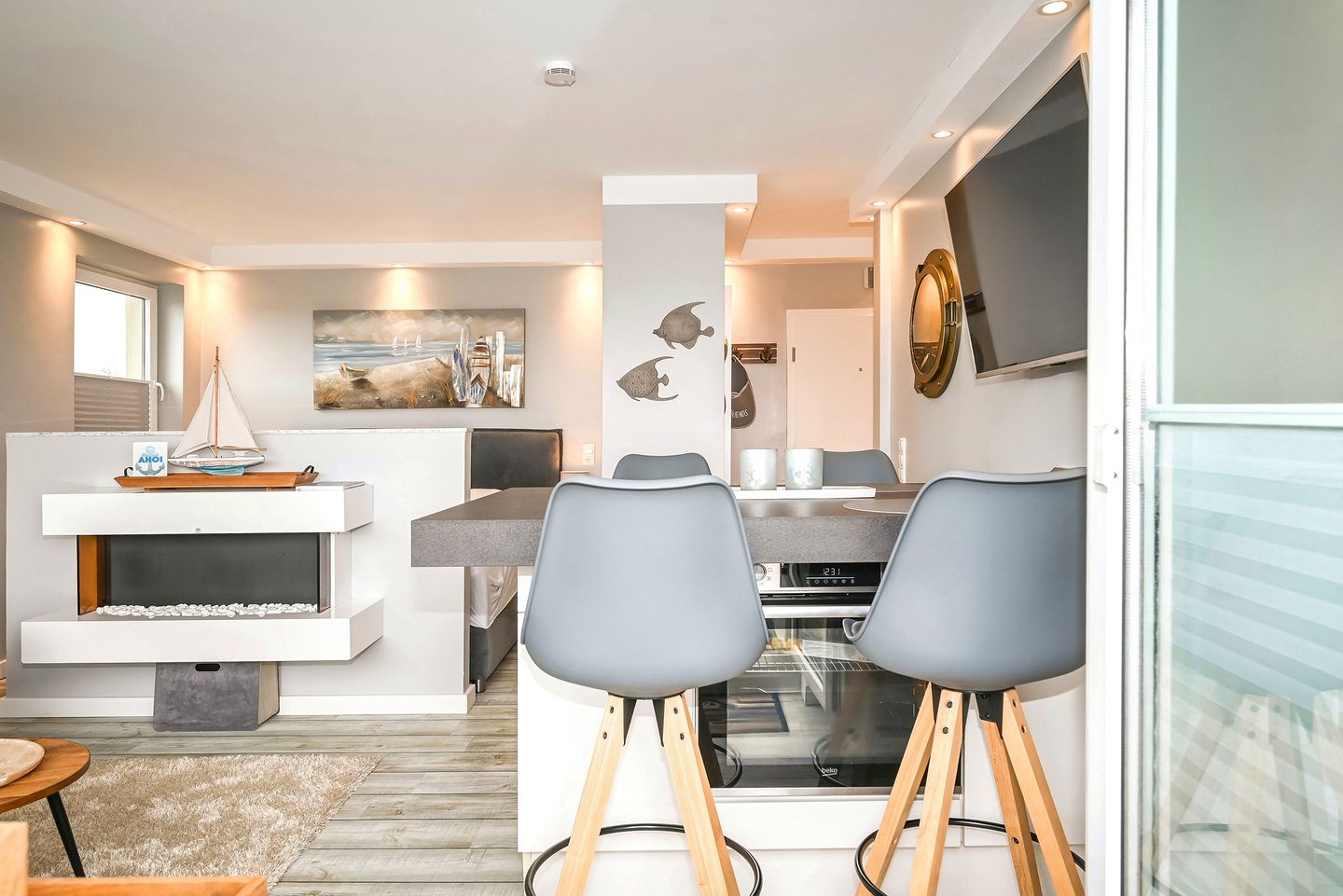 Die stilvoll eingerichtete 1-Raum-Wohnung im 2. Obergeschoss bietet Platz für bis zu zwei Personen und überzeugt durch modernen Komfort sowie maritimen Charme. Der offene Wohn- und Schlafbereich ist mit einem komfortablen Boxspringbett ausgestattet – perfekt für Paare oder Alleinreisende.