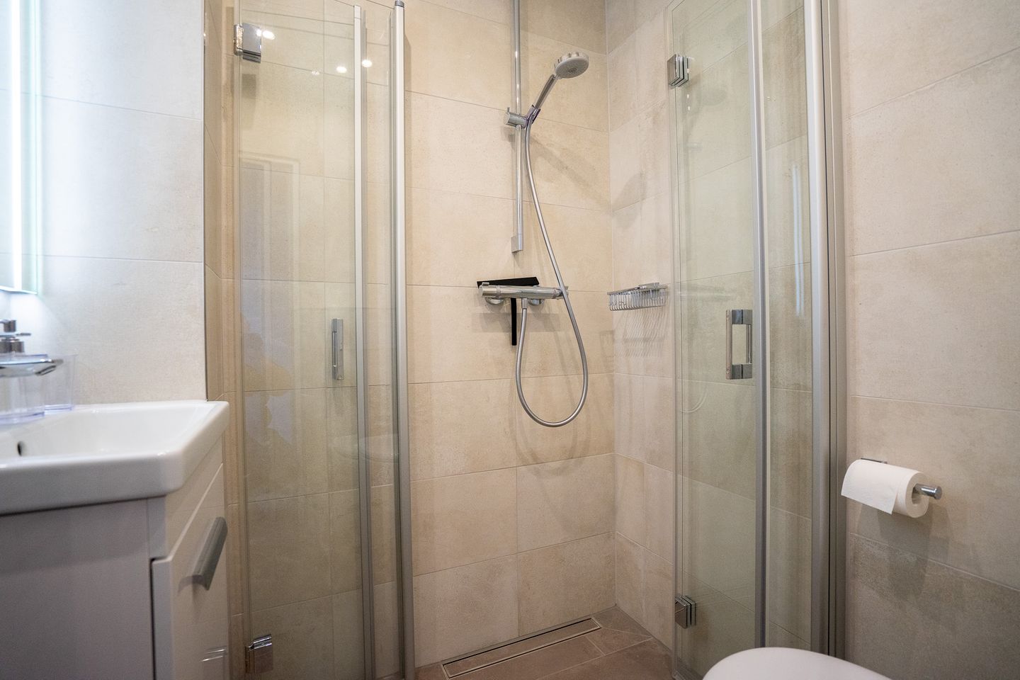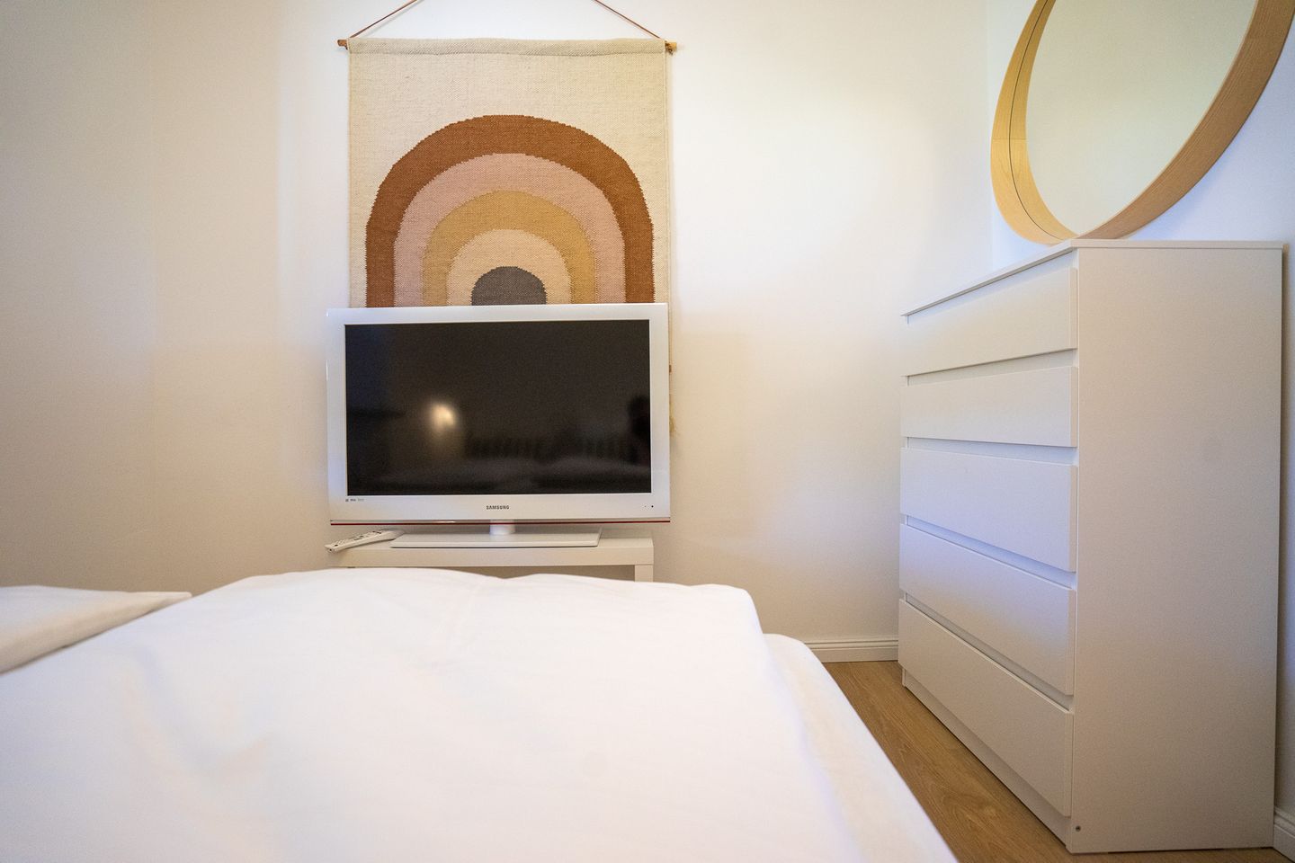 Die Wohnung ist aufgeteilt in zwei Schlafzimmer mit jeweils einem Doppelbett. Eines der Schlafzimmer verfügt über einen zusätzlichen Fernseher mit Fire TV Stick (kein Free-TV).