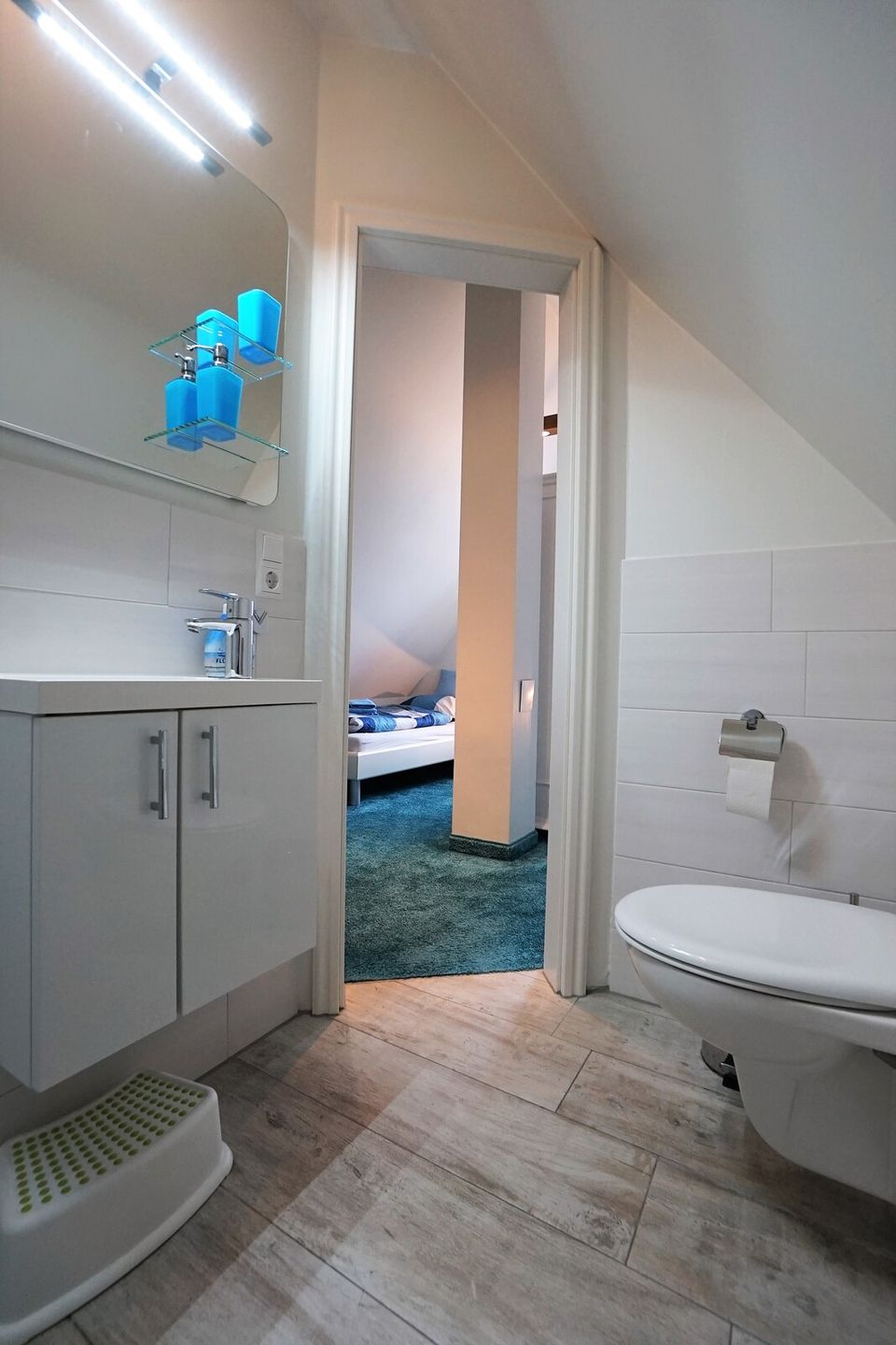 Einzelbetten. Direkt an dieses Schlafzimmer grenzt ein kleines Badezimmer mit