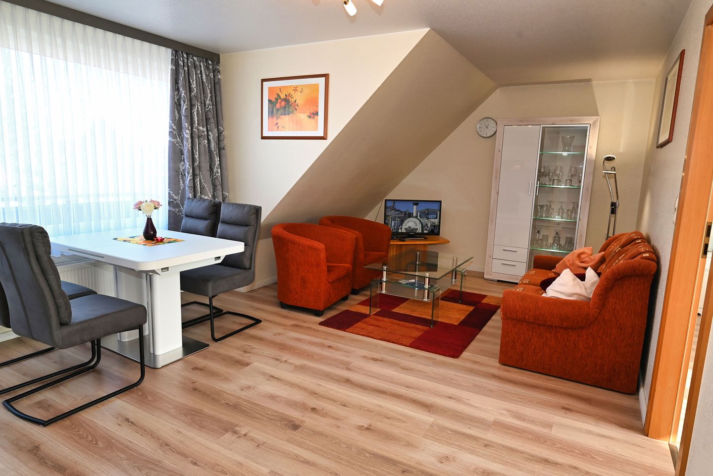 Die komfortable 2-Raum-Wohnung ist in einen Wohn- und Essbereich mit offener Küche, ein Schlafzimmer und ein Bad mit Dusche unterteilt. Auf der bequemen Schlafcouch im Wohnzimmer finden zwei Personen Platz.