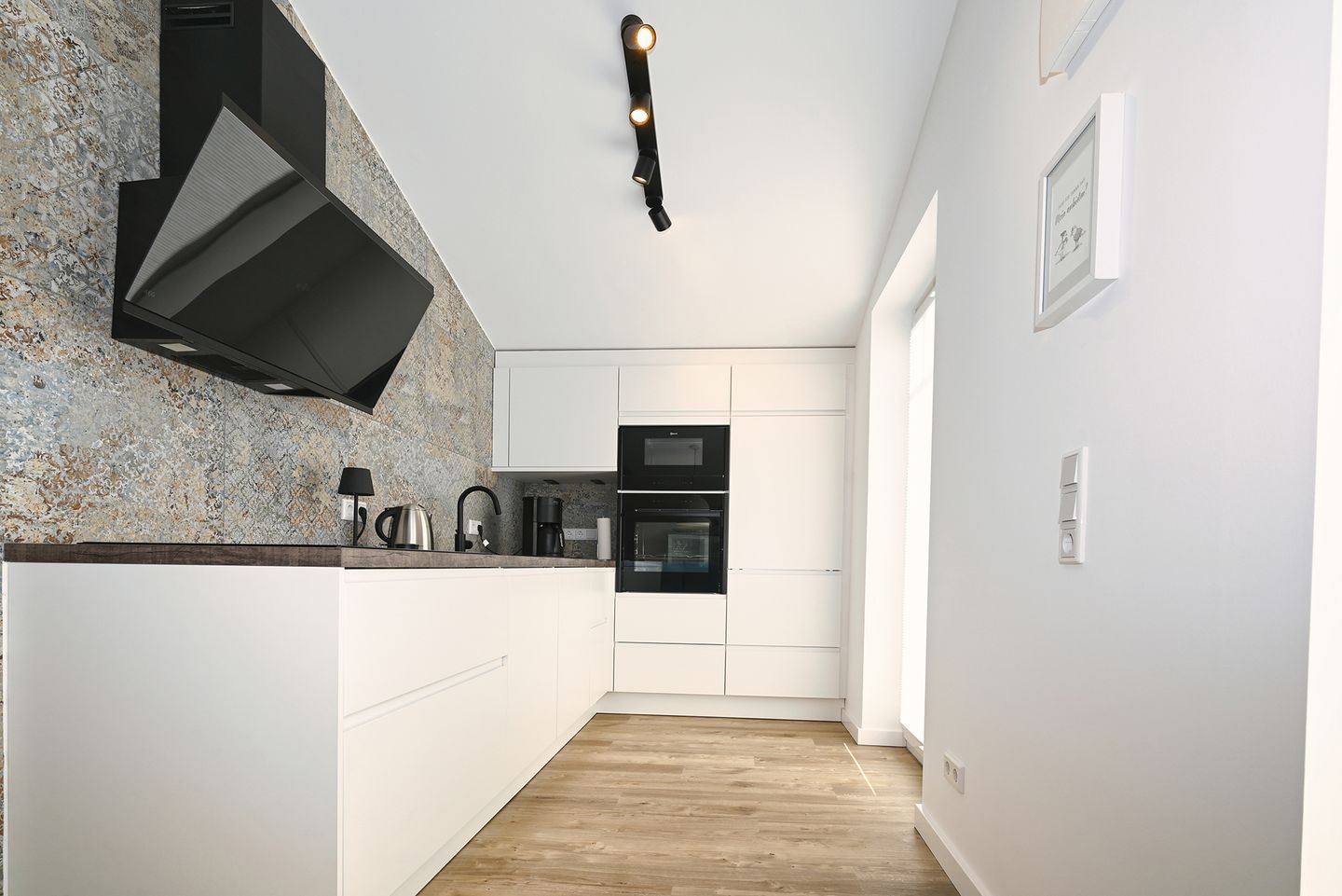 Die offene Küche mit mediteranem Flair ist zum Wohnbereich integriert und sorgt für gemeinsame Mahlzeiten. Ausgestattet ist sie unter anderem mit Induktionsherd, Backofen, Mikrowelle, Kühlschrank mit Gefrierfach, Spülmaschine, Kaffeemaschine, Wasserkocher, Toaster sowie Küchenutensilien, Geschirr und Besteck.