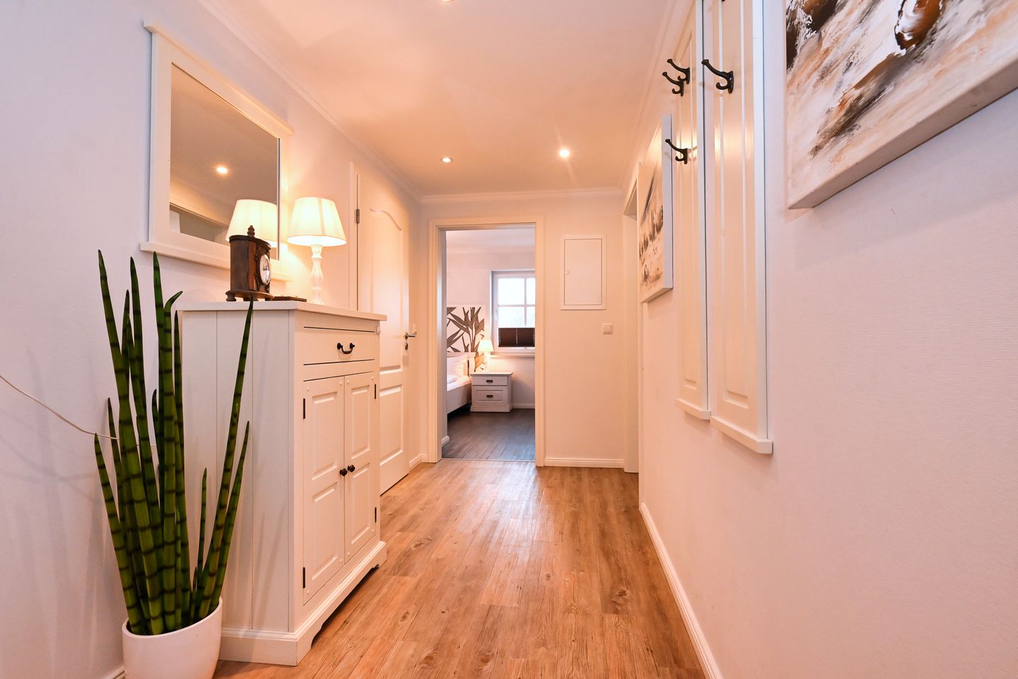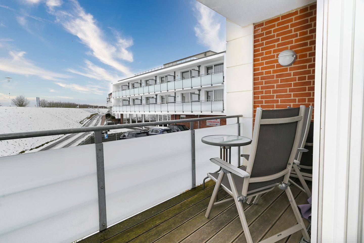 Die großzügige Ferienwohnung mit kompletter Fussbodenheizung liegt in der 1. Etage, erreichbar mit dem Fahrstuhl, hat teilweise Hafenblick.