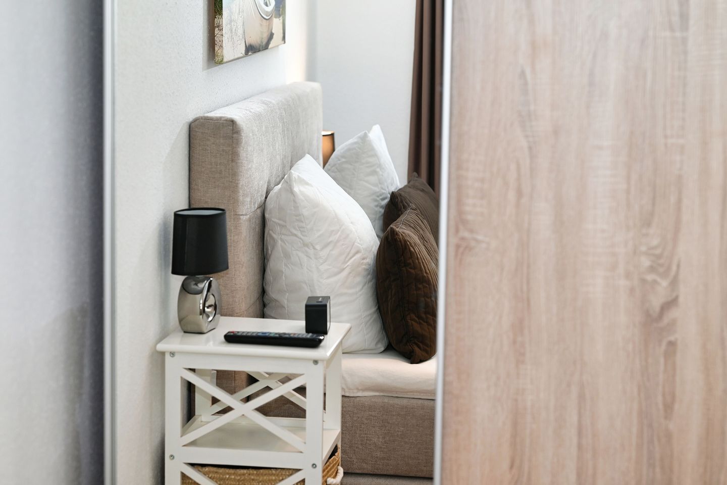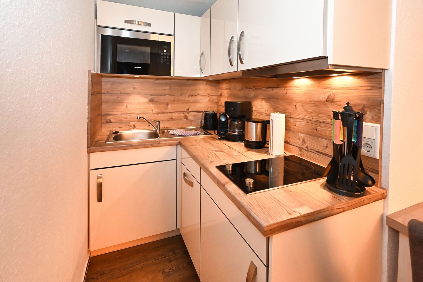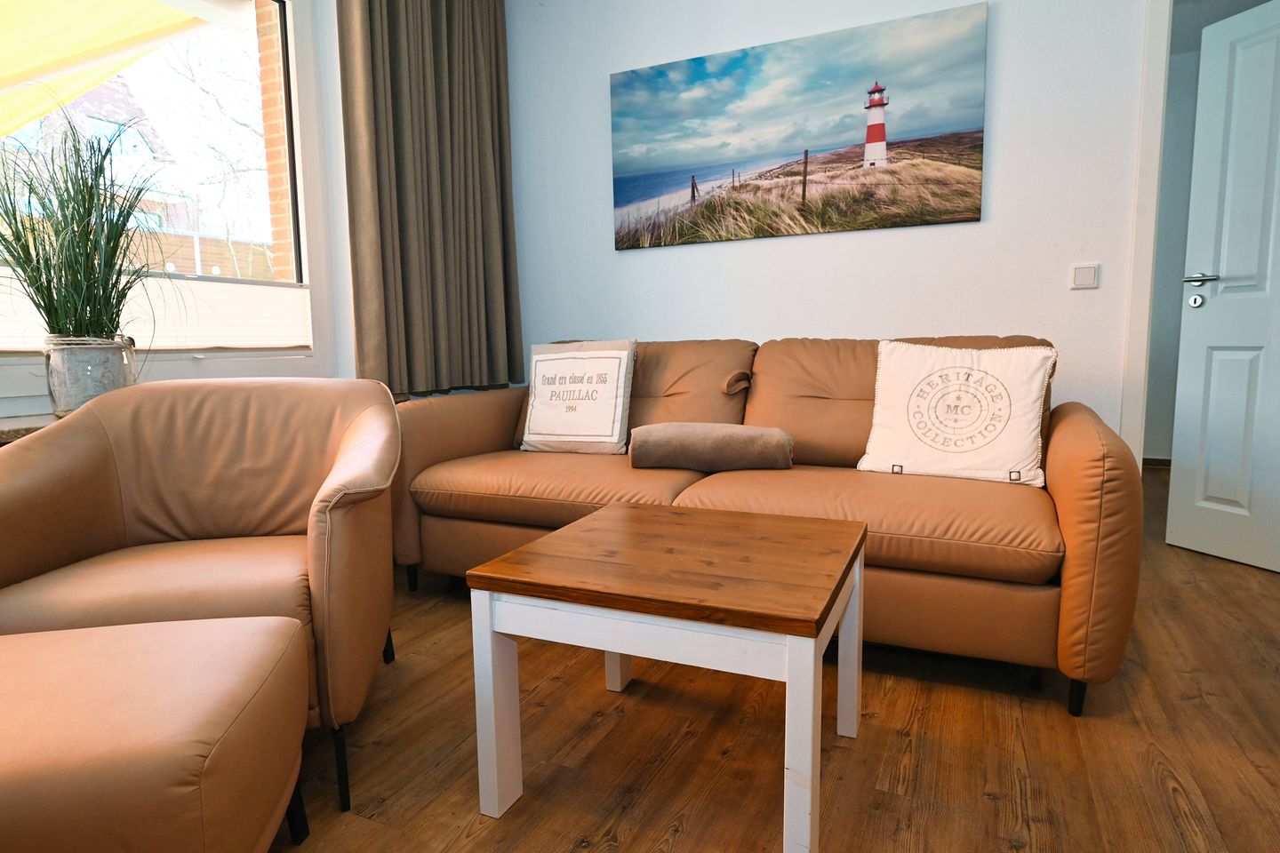 Die Ferienwohnung ist modern und geschmackvoll eingerichtet und bietet eine harmonische Verbindung zwischen Komfort und Funktionalität. Ein gemütliches Schlafzimmer lädt zum Entspannen ein und garantierte erholsame Nächte. Das offene Wohnkonzept mit einem hellen Wohnzimmer und einer vollständig ausgestatteten Küche schafft eine einladende Atmosphäre zum geselligen Beisammensein. Genießen Sie Ihre Mahlzeiten am Esstisch oder entspannen Sie auf dem bequemen Sofa, während Sie Ihre Lieblingssendungen im TV verfolgen. Für Unterhaltung sorgt zudem ein DVD-Spieler sowie eine HiFi-Anlage.