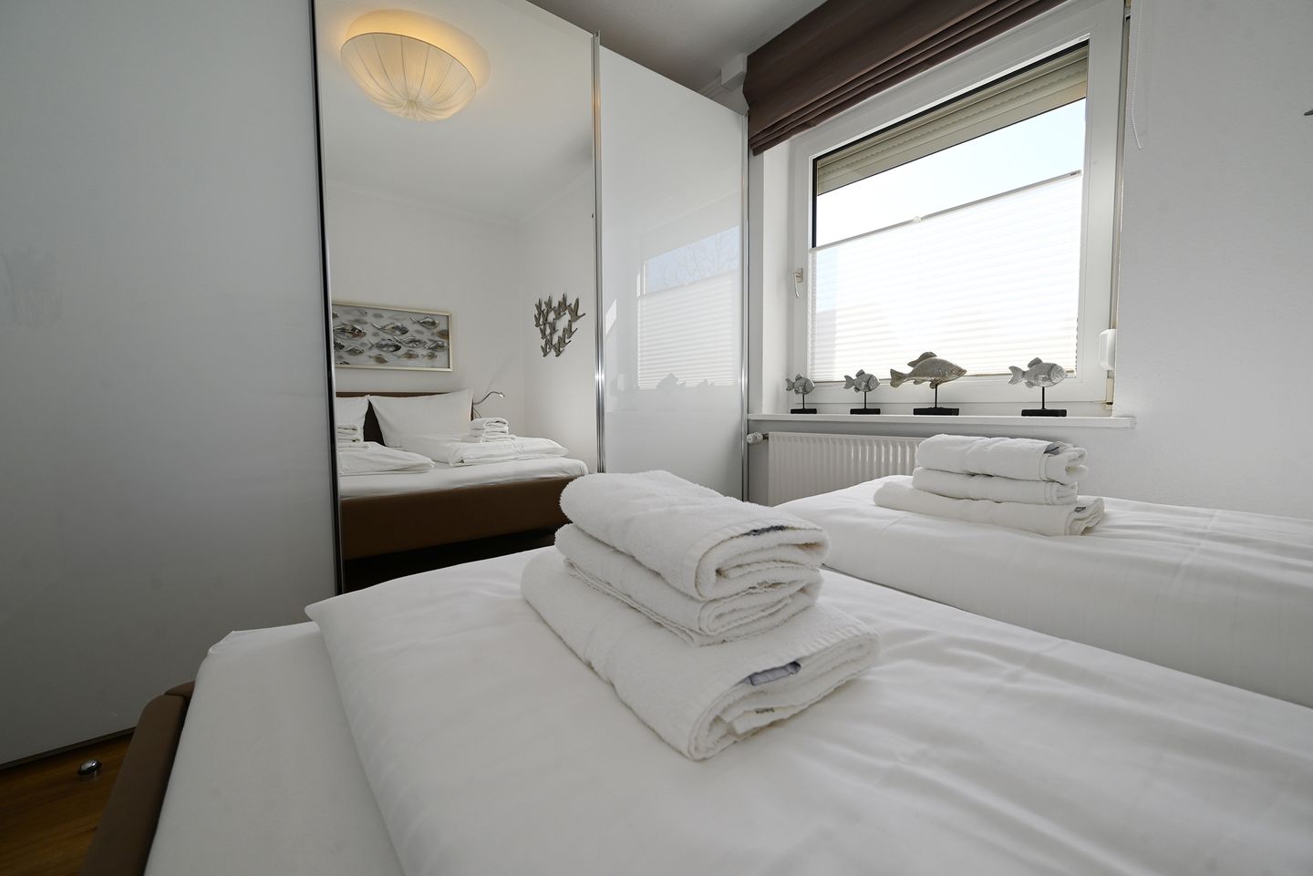 Die Wohnung bietet auf großzügigen 64 m² Platz für bis zu vier Personen. Mit zwei geschmackvoll eingerichteten Schlafzimmern, ausgestattet mit gemütlichen Betten, garantiert sie erholsame Nächte. Der helle Wohnbereich ist offen zur modernen Küche gestaltet, die mit allen Utensilien ausgestattet ist, die Sie für die Zubereitung Ihrer Lieblingsgerichte benötigen. Hier finden Sie unter anderem einen Herd, einen Backofen, eine Mikrowelle, eine Spülmaschine und eine Kaffeemaschine. Der Esstisch lädt zu gemeinsamen Mahlzeiten ein und schafft ein familiäres Ambiente.