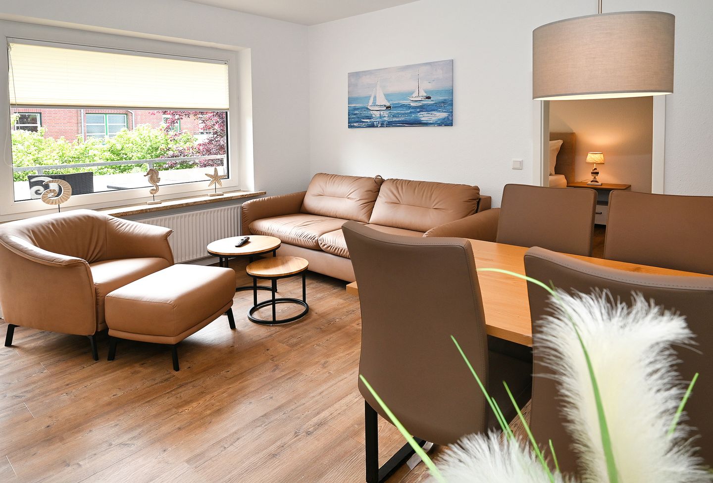 Die Wohnung befindet sich im ersten Stock und wurde 2025 renoviert, sodass Sie sich auf eine stilvolle Einrichtung freuen können. Sie betreten die Wohnung durch einen hellen Flur, der Sie direkt in das lichtdurchflutete Wohnzimmer führt. Hier finden Sie eine komfortable Sofaecke, die zum Entspannen einlädt, sowie einen Fernseher, der für gesellige Abende sorgt. Der angrenzende Essbereich mit einem Esstisch steht für gemeinsame Mahlzeiten oder gesellige Spieleabende bereit.