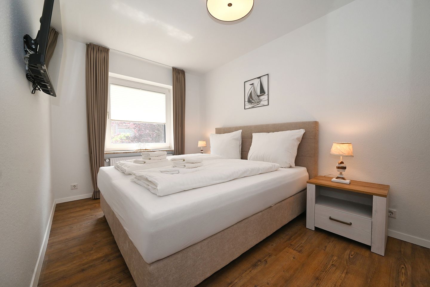 Mit einem komfortablen Boxspringbett bietet es alles, was Sie für eine erholsame Nachtruhe benötigen. Ein zusätzliches Schlafsofa im Wohnzimmer kann für weitere Gäste genutzt werden. Das Badezimmer ist modern ausgestattet und bietet neben einer Dusche auch ein WC sowie ein Waschbecken.