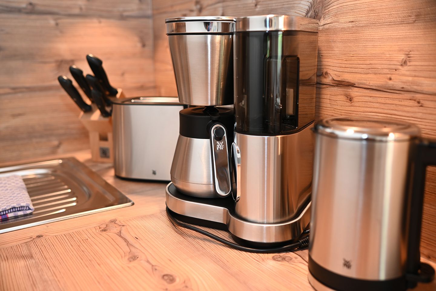 Die offen gestaltete Küche ist ideal für kulinarische Experimente und ist mit allem ausgestattet, was Sie benötigen. Dazu gehören unter anderem ein Cerankochfeld, ein Backofen sowie verschiedene Küchenutensilien. Für Ihre täglichen Bedürfnisse stehen ein Kühlschrank mit integriertem Gefrierfach, eine Mikrowelle und eine Kaffeemaschine bereit. Hier können Sie bequem Ihr Frühstück zubereiten und den Tag mit einem frischen Kaffee beginnen.