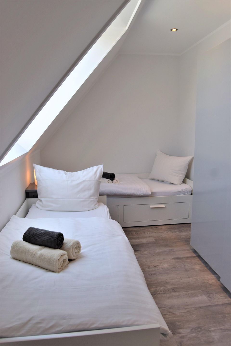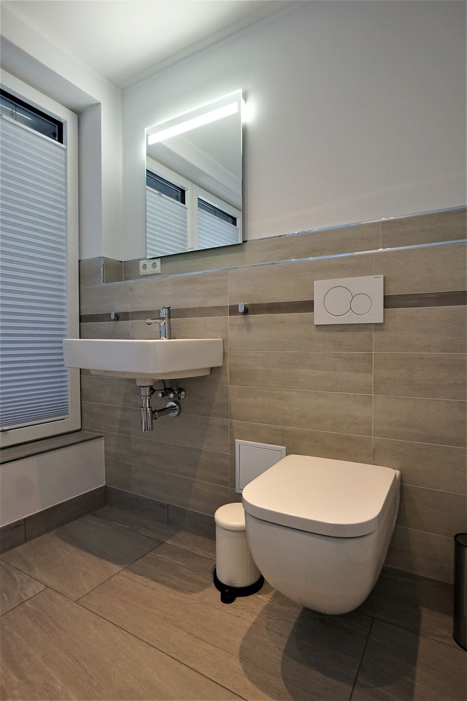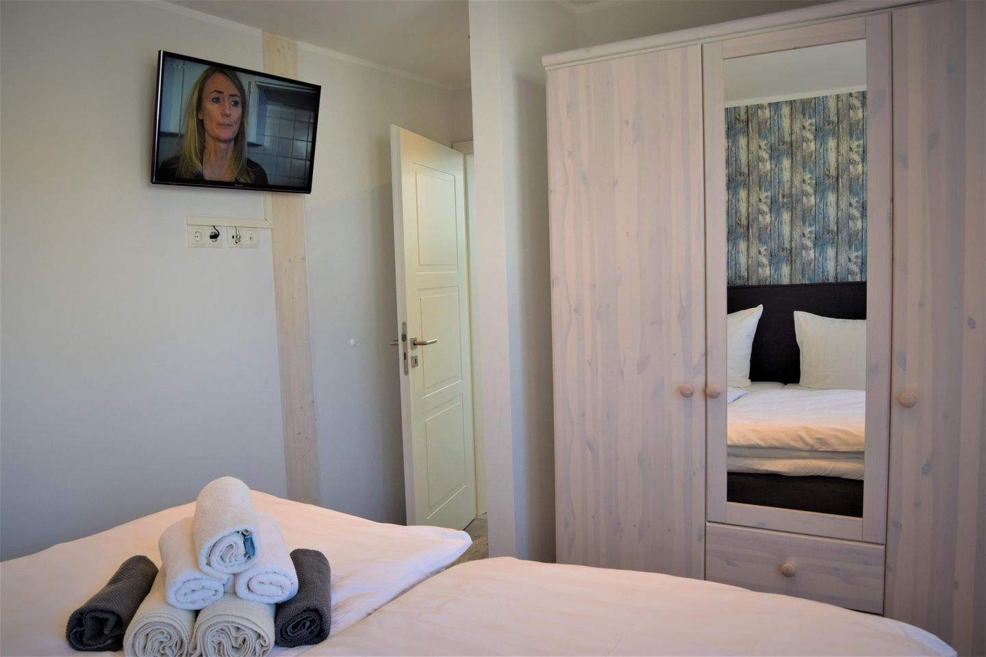Jedes Schlafzimmer verfügt über einen Smart-TV. Im Ferienhaus gibt es insgesamt zwei Bäder und ein Gäste-WC, das Bad im Obergeschoss verfügt über eine Dusche.
