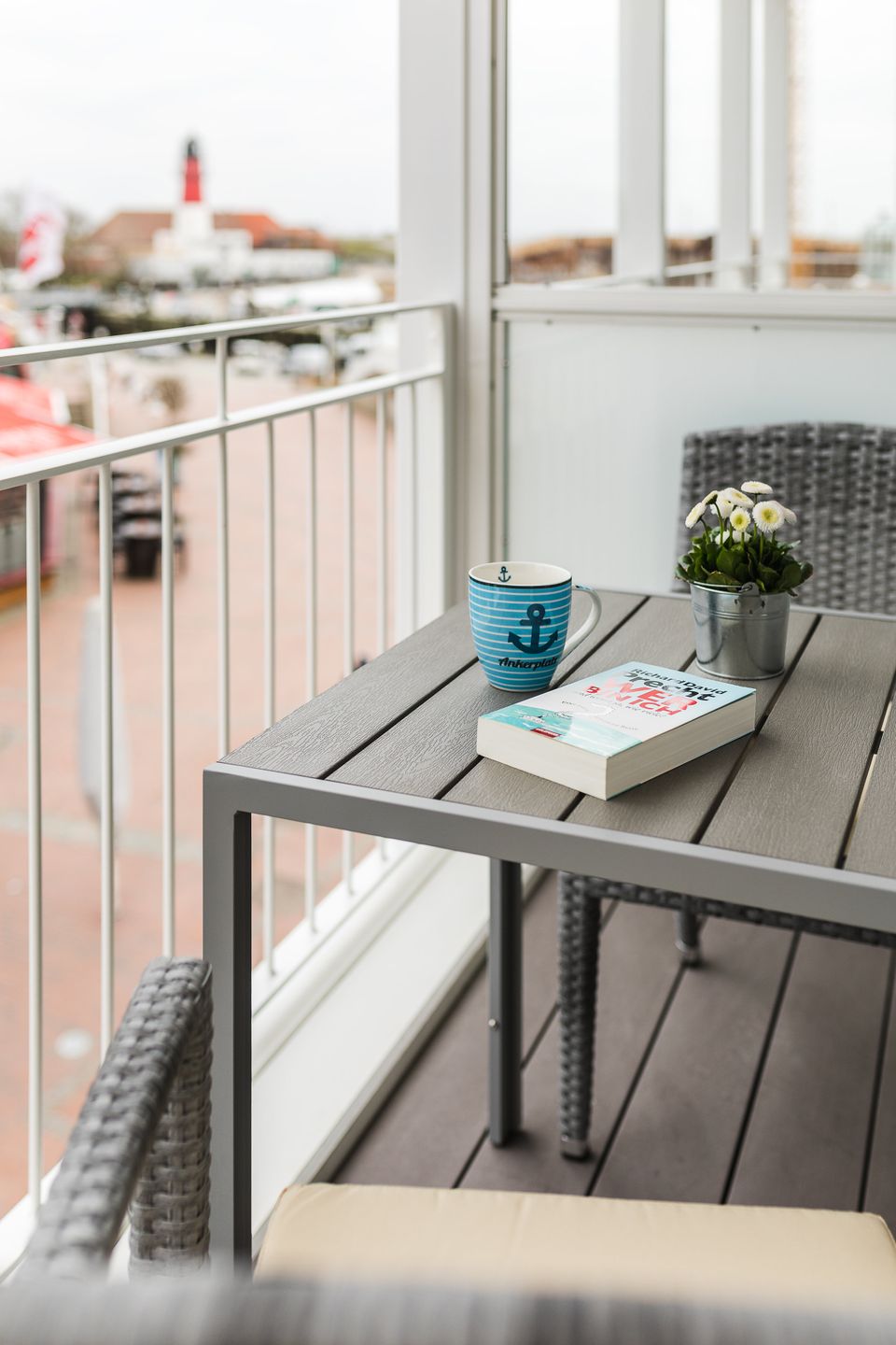 Auf dem Balkon (Südost-Ausrichtung) genießen Sie den Blick auf den Büsumer Leuchtturm und den Museumshafen – oder möchten Sie lieber das bunte Treiben in der Fußgängerzone beobachten?