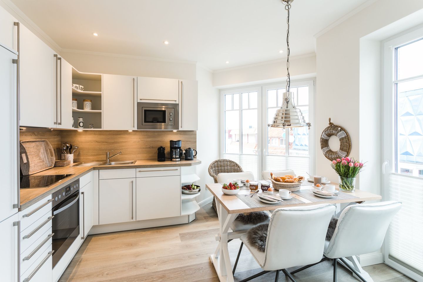 Die Wohnungen sind mit hochwertigen Möbeln und Designobjekten ausgestattet. Weiterhin sind ein WLAN-Radio im Badezimmer, eine Bose Musikanlage mit Internetradio, Smart-TVs in allen Wohn- und Schlafzimmern, Videogegensprechanlage, WLAN sowie ein Lichtkonzept integriert. In den rückenfreundlichen Boxspringbetten und den allergikerfreundlichen Bettwaren schlafen Sie wie auf Wolke 7. Zudem sind alle Räume sowie das geräumige, komfortable Bad mit einer Fußbodenheizung ausgestattet. Die Küche ist komplett ausgestattet und lässt keine Wünsche offen, sogar eine Nespresso Maschine ist vorhanden, sodass Sie sich rundum wie zuhause fühlen können. Eine Waschmaschine, Kofferkarre und Kinderhochstuhl stehen ebenfalls im Hausflur zur freien Verfügung bereit.