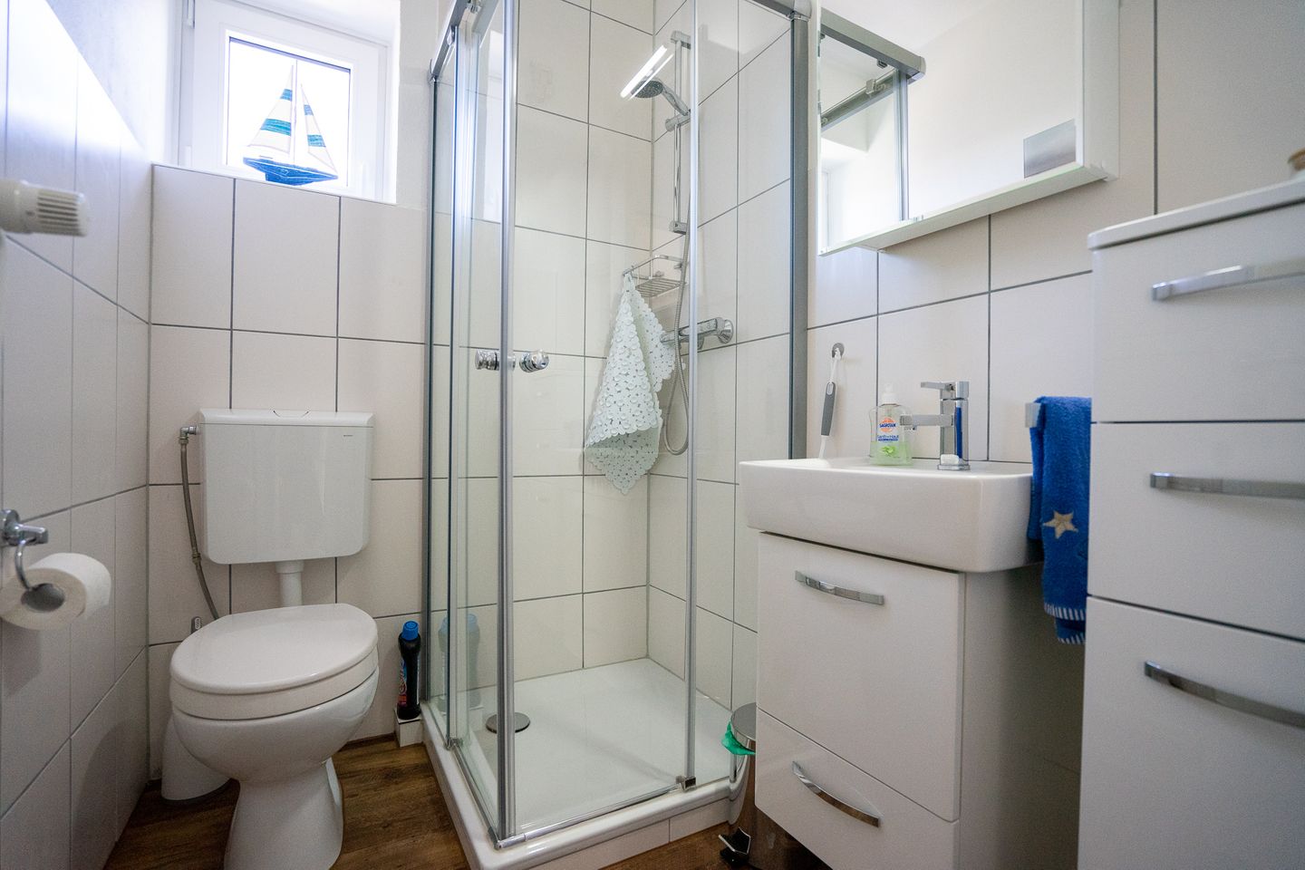 In der zweiten Etage erwartet Sie das lichtdurchflutete Wohnzimmer mit offener Küche, ein Schlafzimmer mit Doppelbett sowie das Badezimmer.