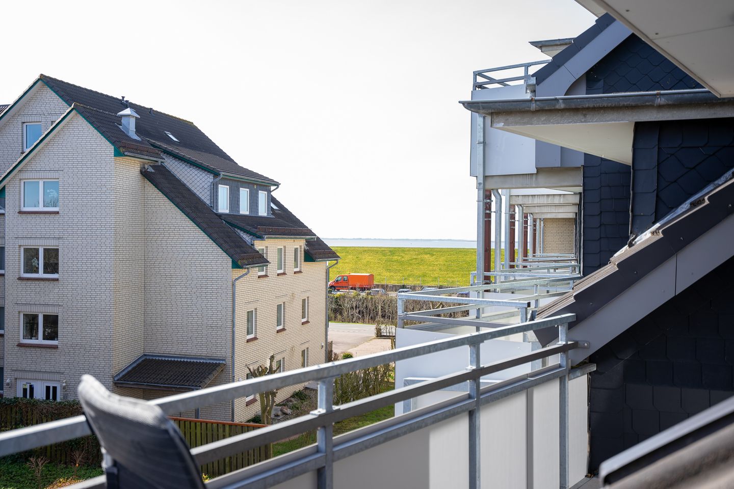 Vom Wohnzimmer aus haben Sie Zugang zum sonnigen Südost-Balkon mit seitlichem Meerblick.