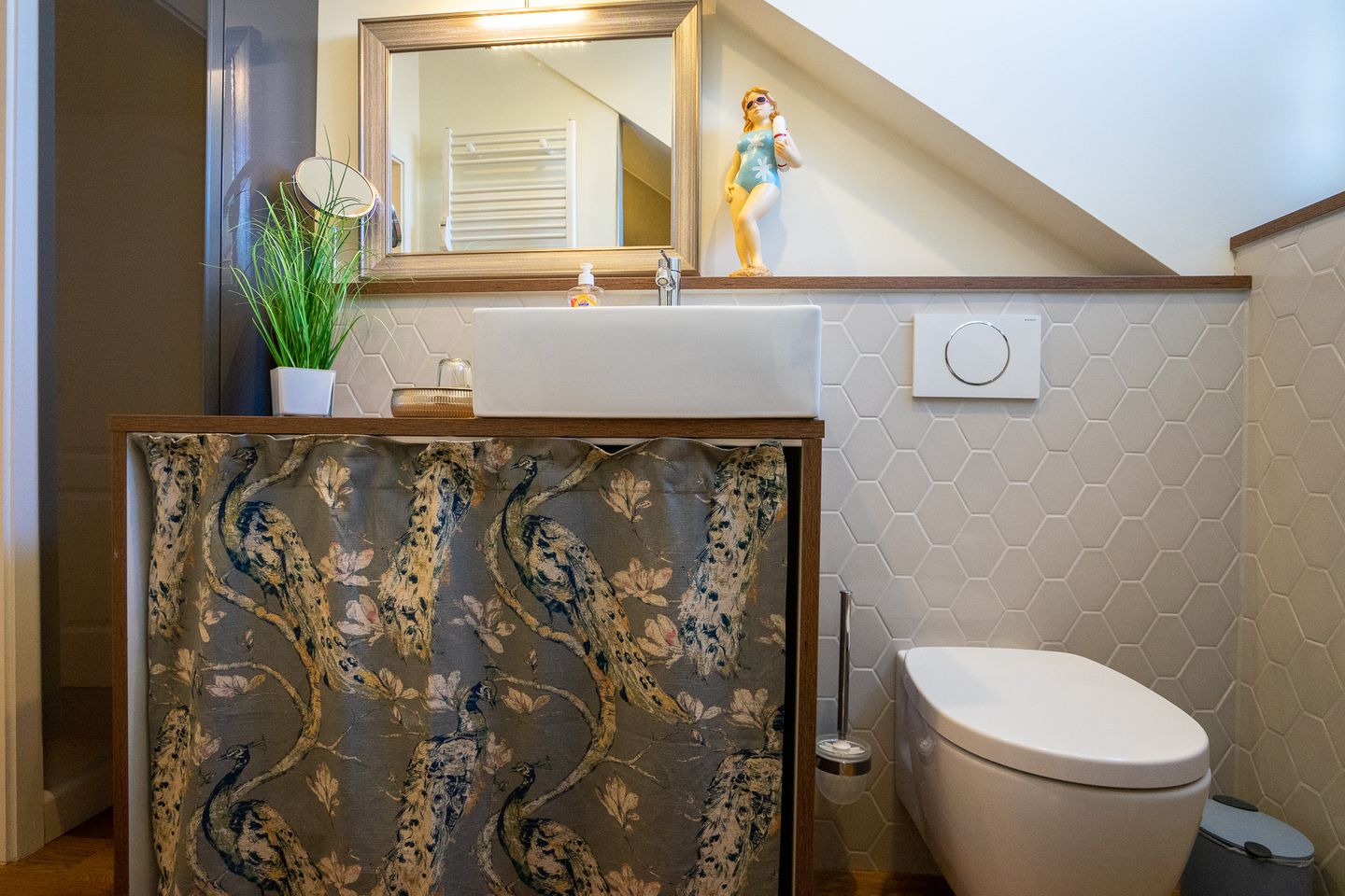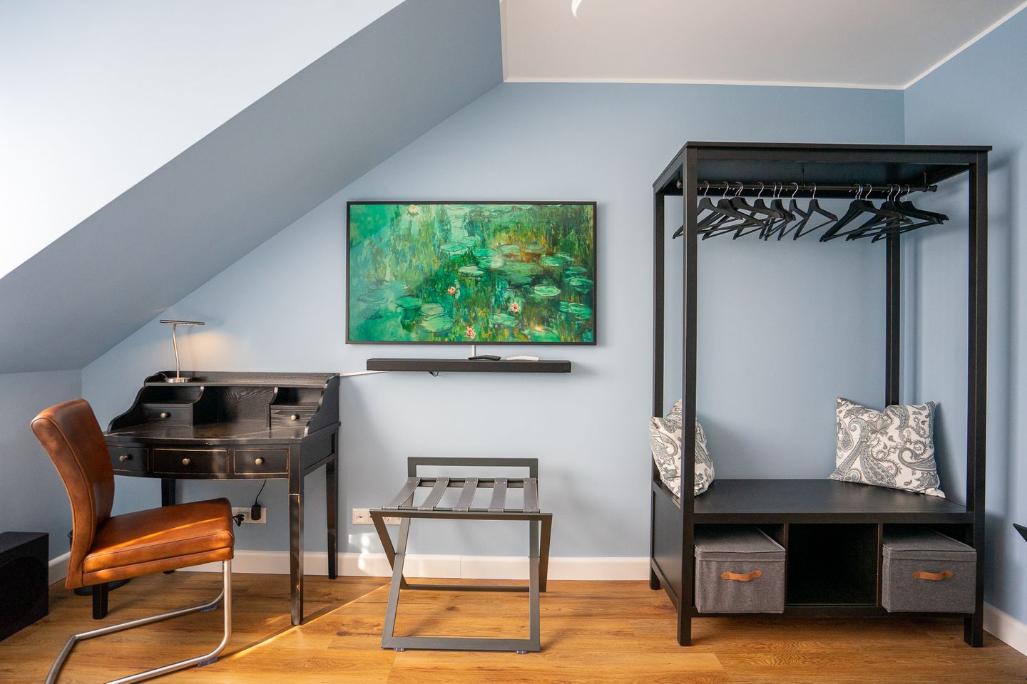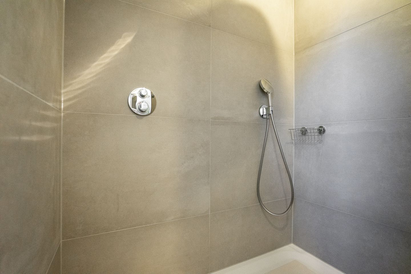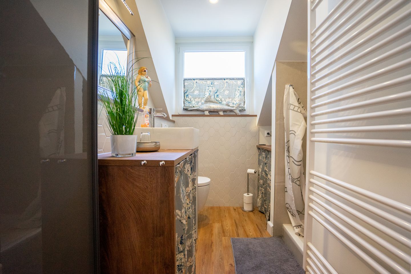 Im Obergeschoss befindet sich das moderne Badezimmer mit Dusche. Das Schlafzimmer mit Smart-TV besticht durch seinen hohen Wohlfühlfaktor.