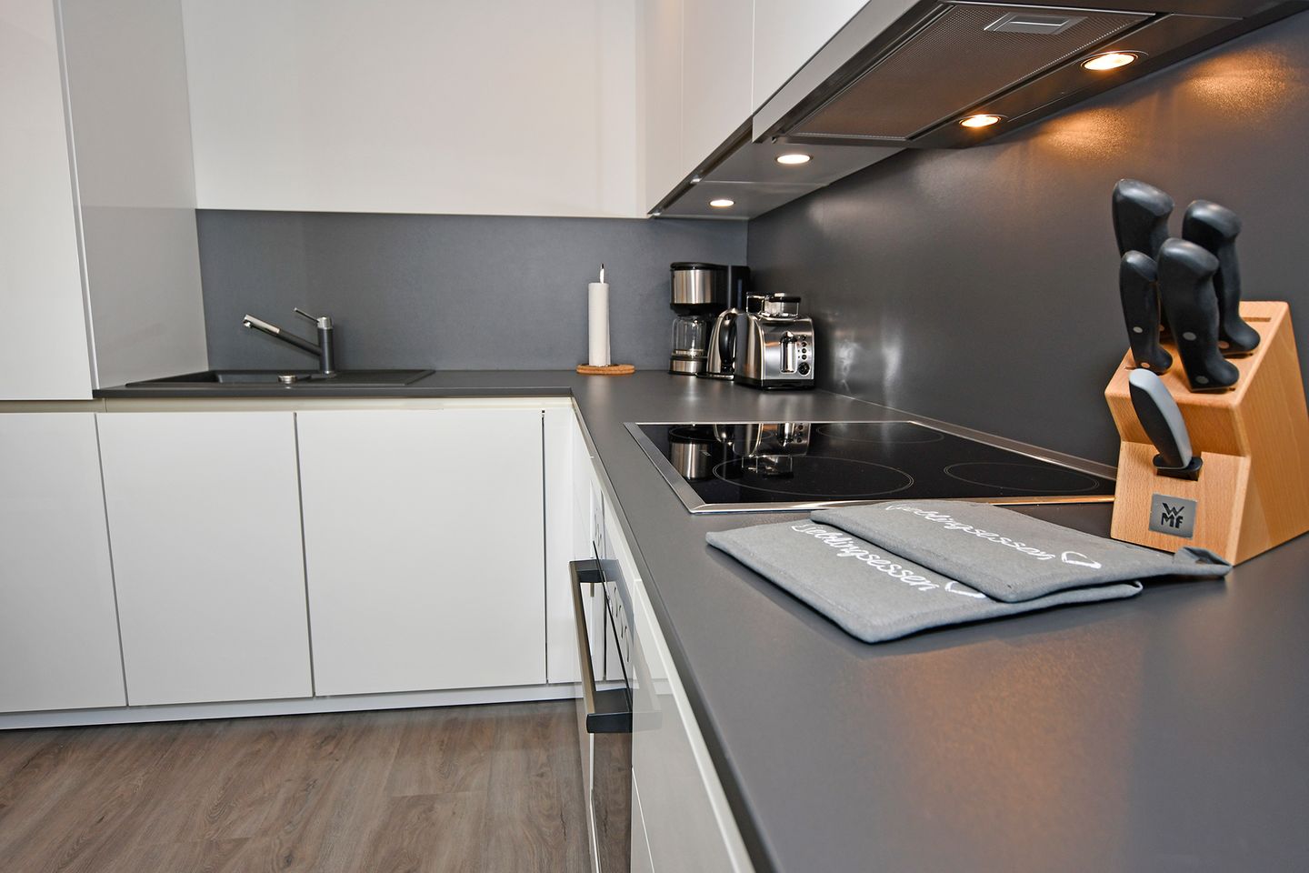 Die moderne Küche ist mit allen notwendigen Annehmlichkeiten ausgestattet, darunter ein Cerankochfeld, ein Backofen, eine Spülmaschine und eine Mikrowelle. Hier können Sie Ihre Kochkünste entfalten und regionale Spezialitäten zubereiten. Zudem stehen Ihnen eine gemeinschaftliche Waschmaschine und Trockner zur Verfügung, um die alltäglichen Annehmlichkeiten in Ihrem Urlaub zu gewährleisten.