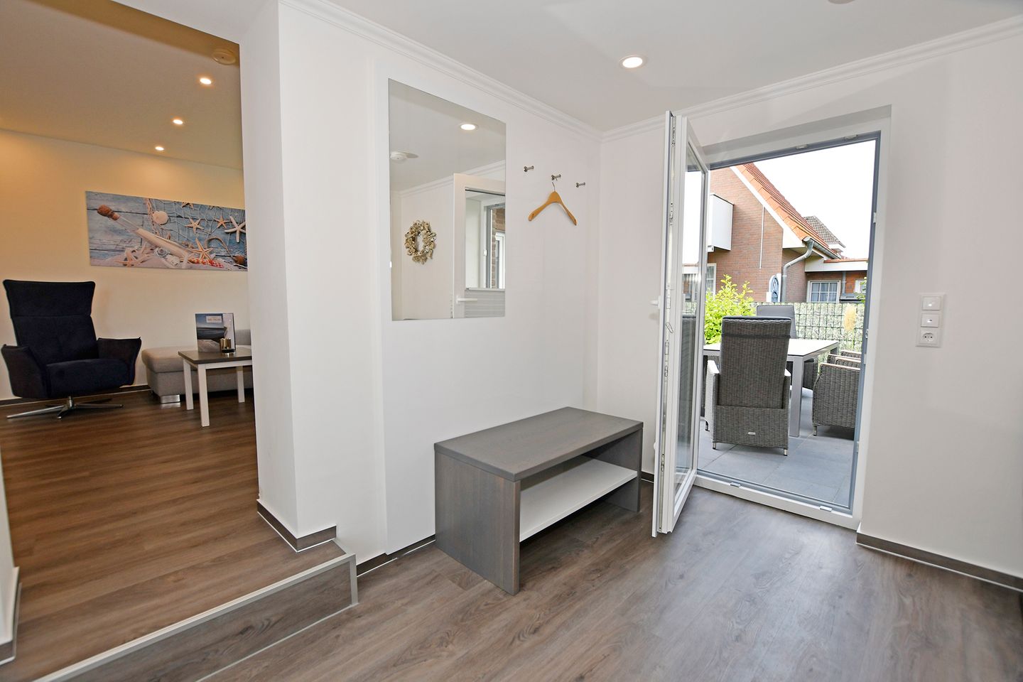 Die Wohnung verfügt über zwei komfortable Schlafzimmer, die eine ruhige Nachtruhe garantieren. Der offene Wohnbereich ist einladend und lichtdurchflutet, ausgestattet mit hochwertigen Möbeln und einem gemütlichen Sofa, auf dem Sie nach einem erlebnisreichen Tag entspannen können. Genießen Sie gemeinsame Mahlzeiten am großen Esstisch oder auf der sonnigen Terrasse, die mit Gartenmöbeln ausgestattet ist und den perfekten Ort zum Entspannen im Freien bietet.