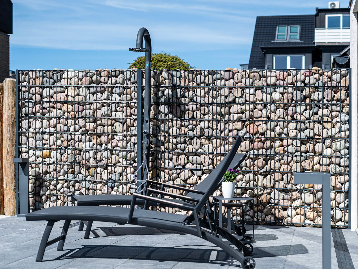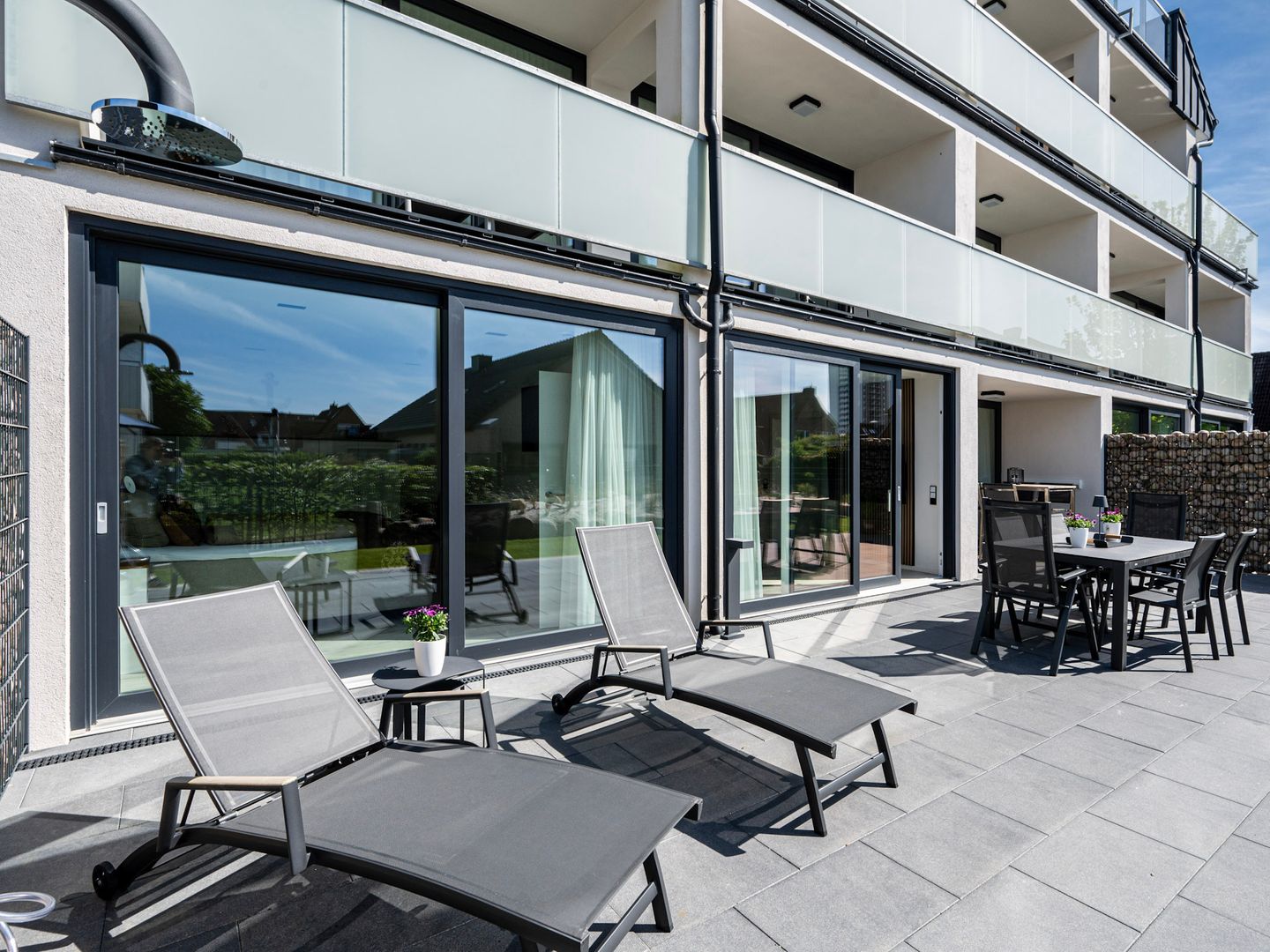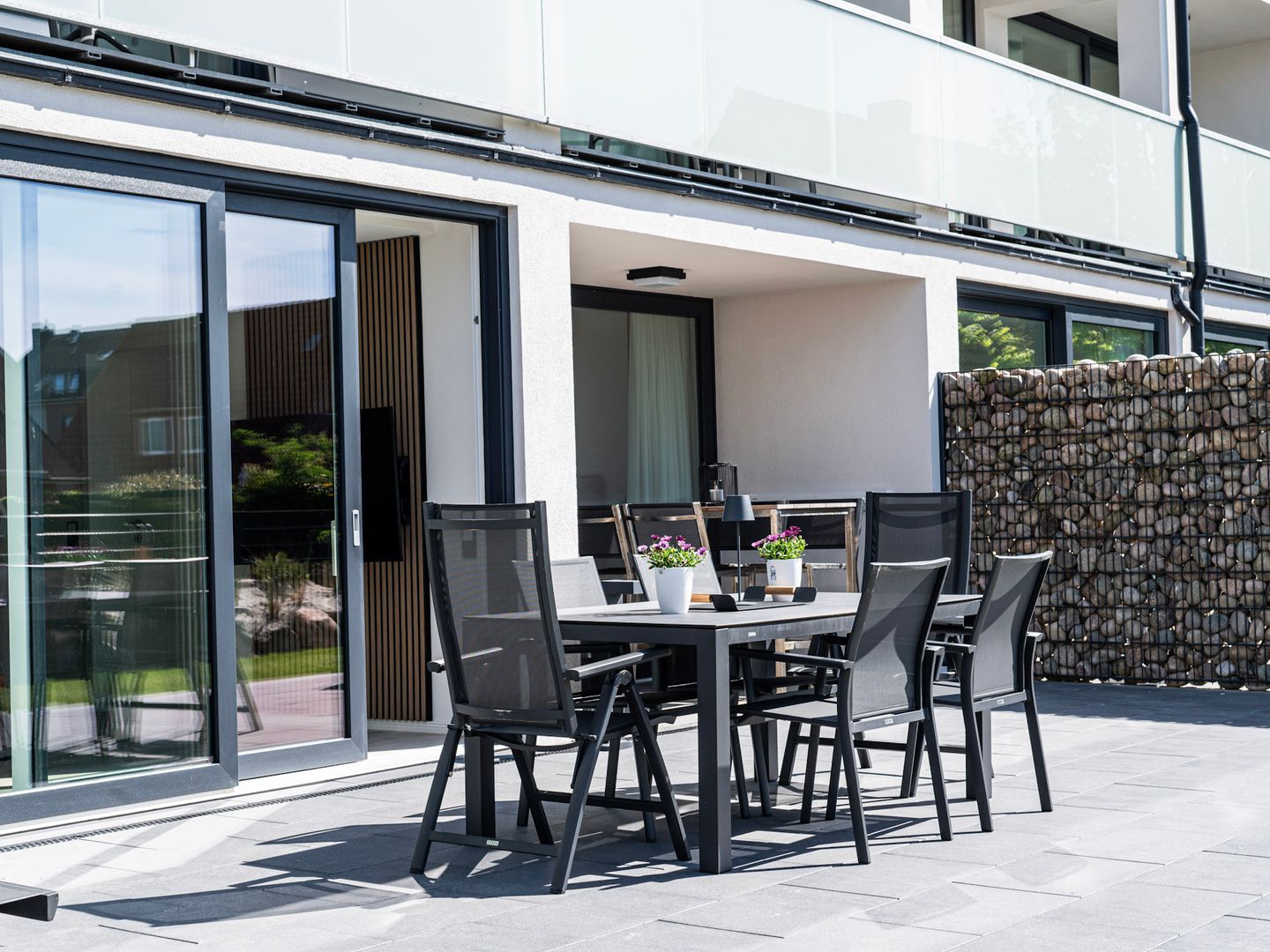 Eine große Terrasse mit Gartenmöbeln lädt dazu ein, die frische Meeresbrise zu genießen oder den Tag entspannt ausklingen zu lassen. Ein eigener Parkplatz steht Ihnen ebenfalls zur Verfügung, was Ihren Aufenthalt noch komfortabler gestaltet.