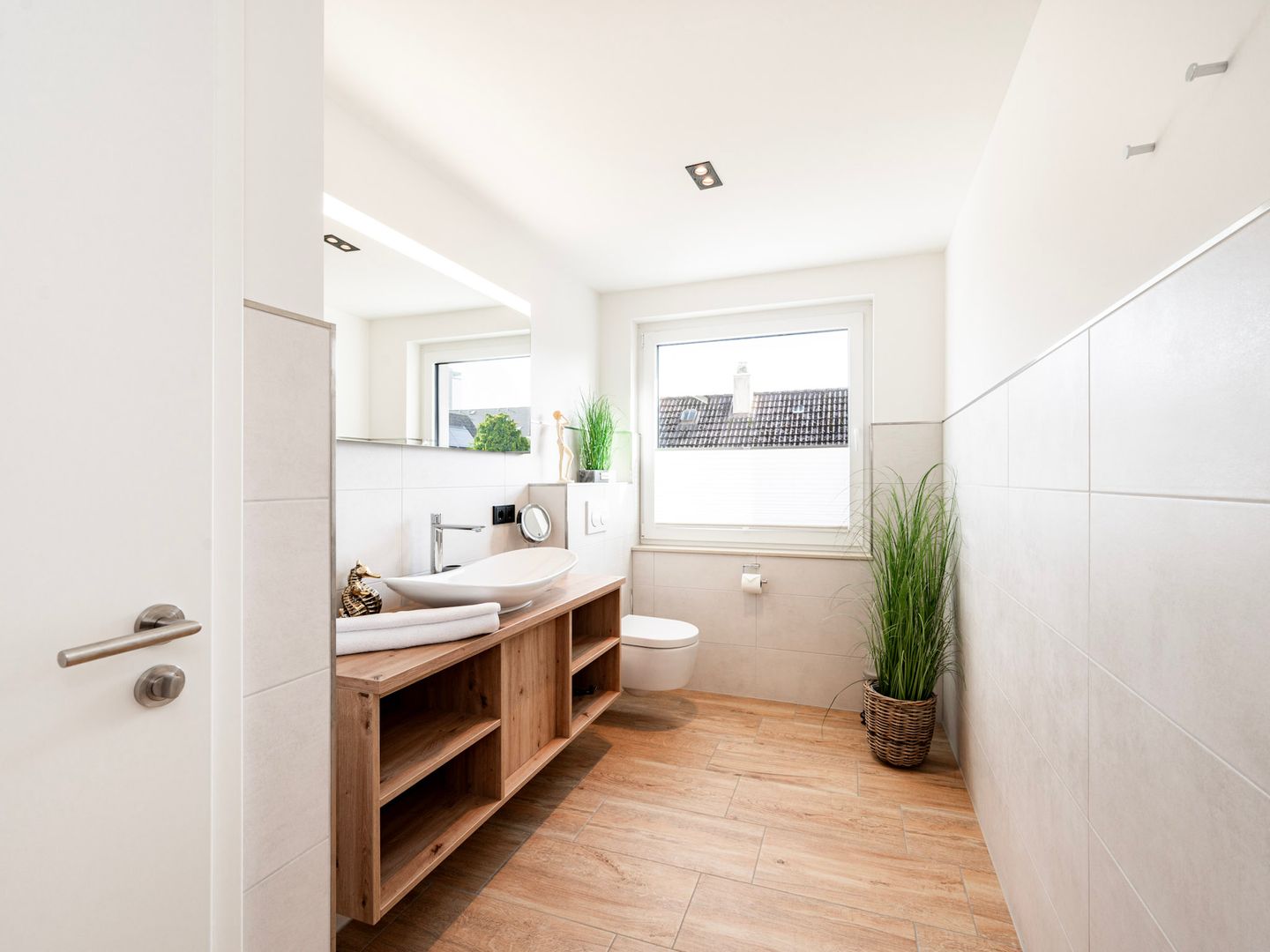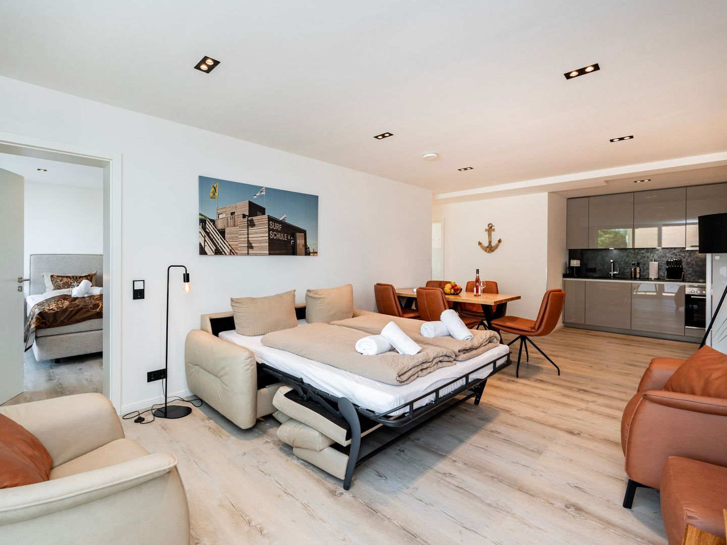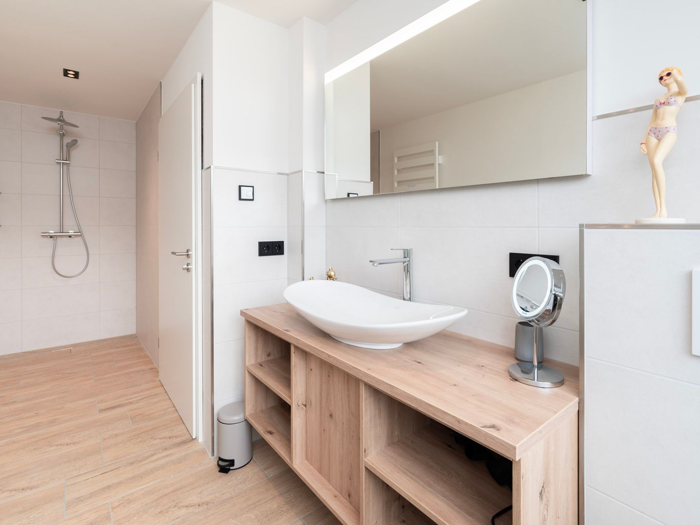 Zwei Schlafzimmer erwarten Sie, eines davon mit einem Doppelbett und das andere mit Schlafmöglichkeiten für bis zu vier Gäste. Die gemütlichen Betten garantieren Erholung und Entspannung nach einem aufregenden Tag an der Nordsee. Das Badezimmer besticht durch ein elegantes, bodengleiches Duschsystem und moderne Ausstattung, inklusive Kosmetikspiegel und Haartrockner.