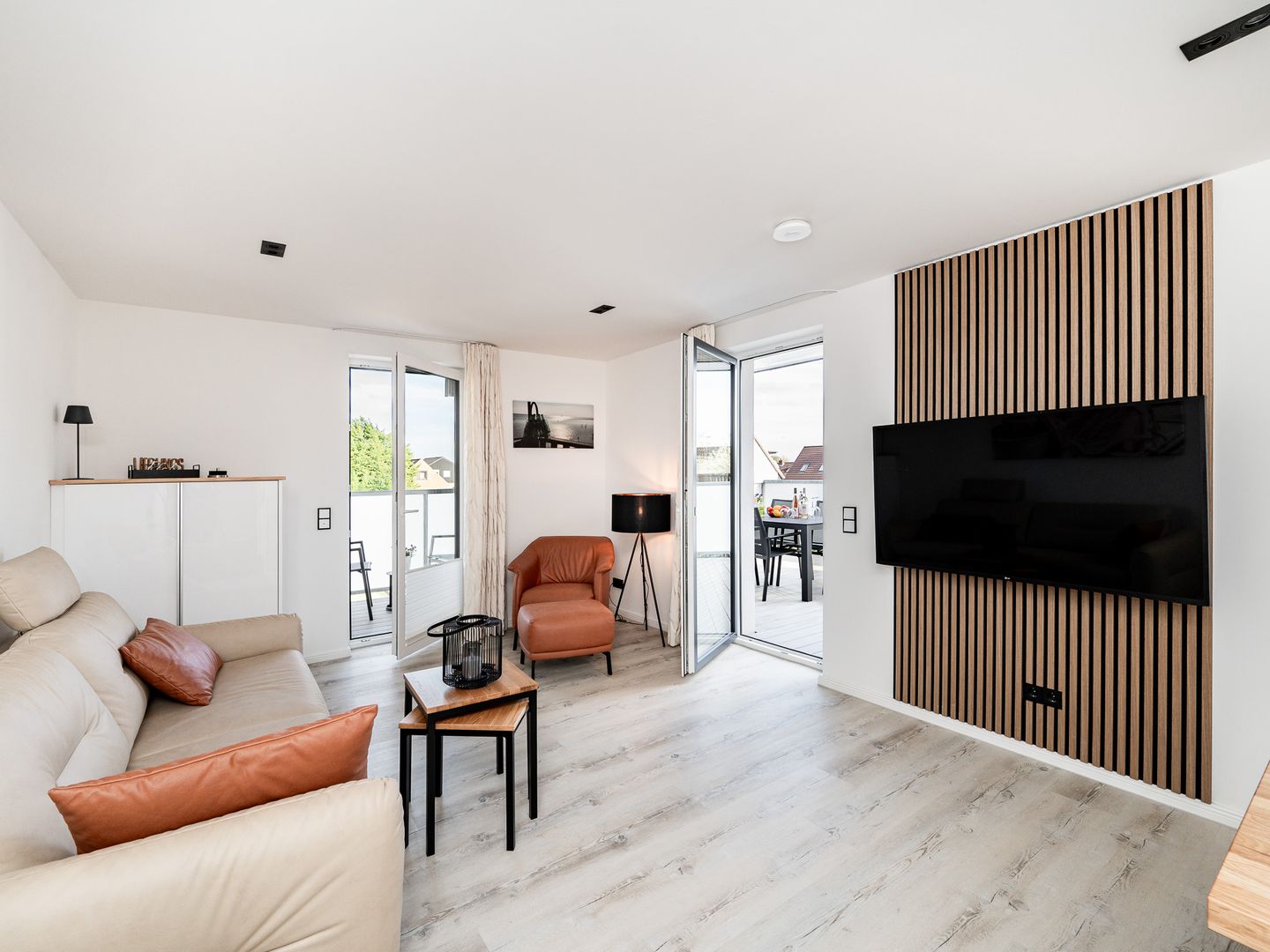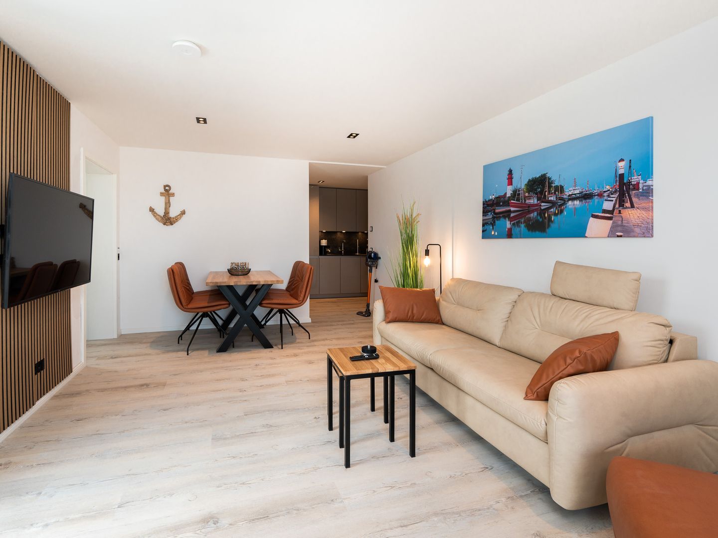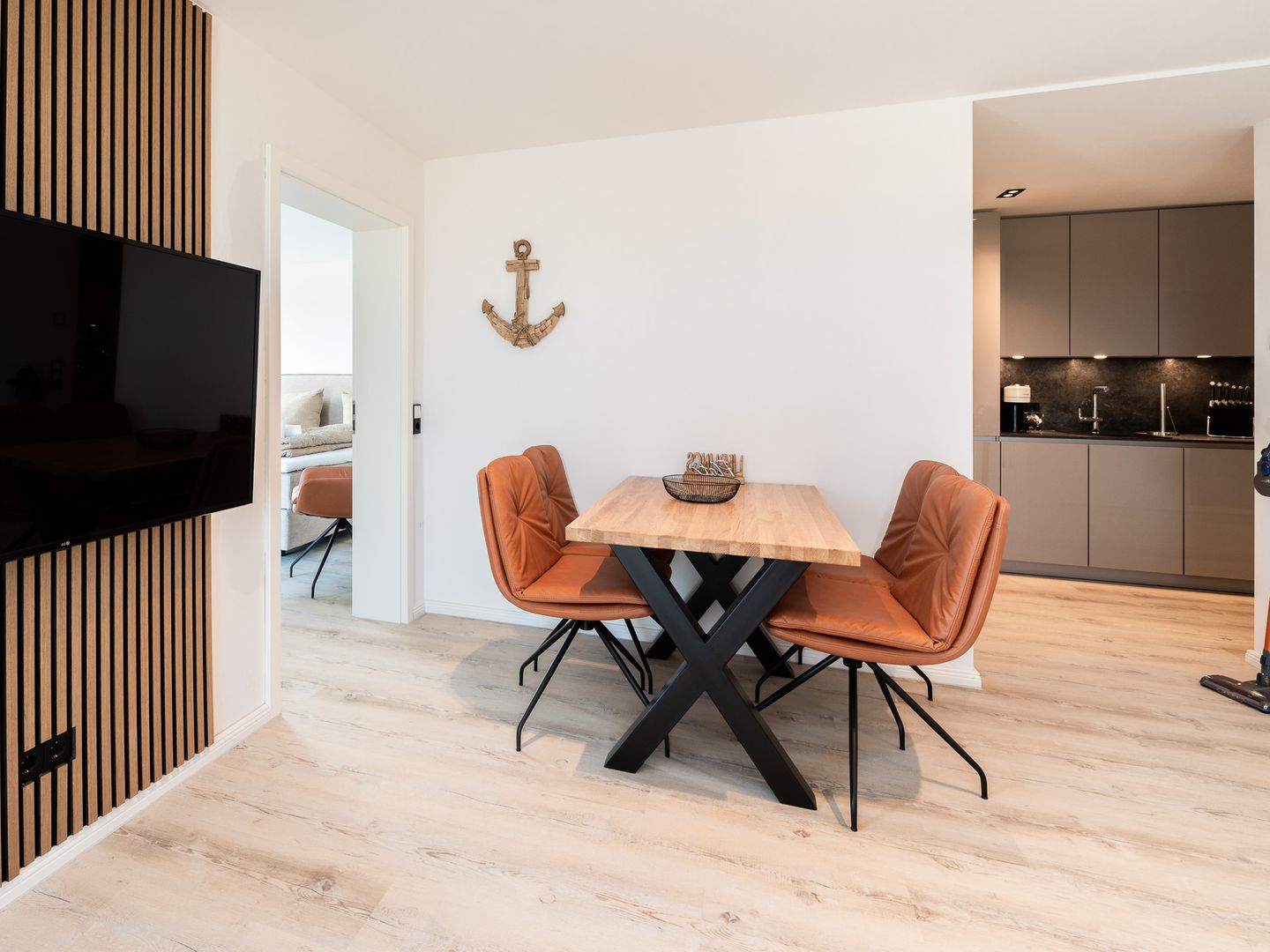 Die Wohnung besteht aus einem Schlafzimmer und einem hellen, offenen Wohnbereich mit einer voll ausgestatteten Küche. Kochen Sie, ohne auf moderne Annehmlichkeiten zu verzichten – die Küche verfügt über einen Herd, ein Ceran-Kochfeld, einen Backofen und eine Spülmaschine, damit Sie sich nach einem Strandtag zurücklehnen und Ihre Lieblingsgerichte genießen können. Der Essbereich lädt zu geselligen Mahlzeiten ein, während Sie die Sofaecke und den TV-Bereich gemütlich zum Entspannen nutzen können.