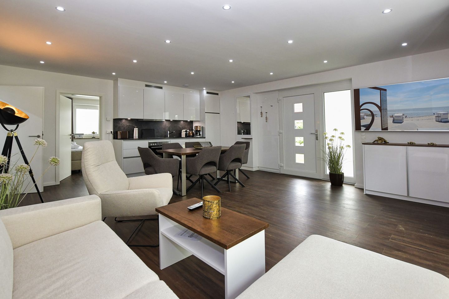 Die Wohnung befindet sich im Parterre und ist für Allergiker geeignet, sodass sich Menschen mit Allergien hier rundum wohlfühlen können. Die offene, lichtdurchflutete Küche ist ein Highlight. Sie ist mit allen modernen Annehmlichkeiten ausgestattet, darunter ein Ceranherd, Backofen, Mikrowelle, Spülmaschine, Kühlschrank mit Gefrierfach und zahlreiche Küchenutensilien. Ob ein schnelles Frühstück oder ein festliches Abendessen – hier gelingen Ihnen kulinarische Köstlichkeiten. Der angrenzende Essbereich lädt zu geselligen Mahlzeiten ein, während das Wohnzimmer mit einer bequemen Sofaecke, Sesseln und einem großen TV zu entspannten Abenden einlädt.
