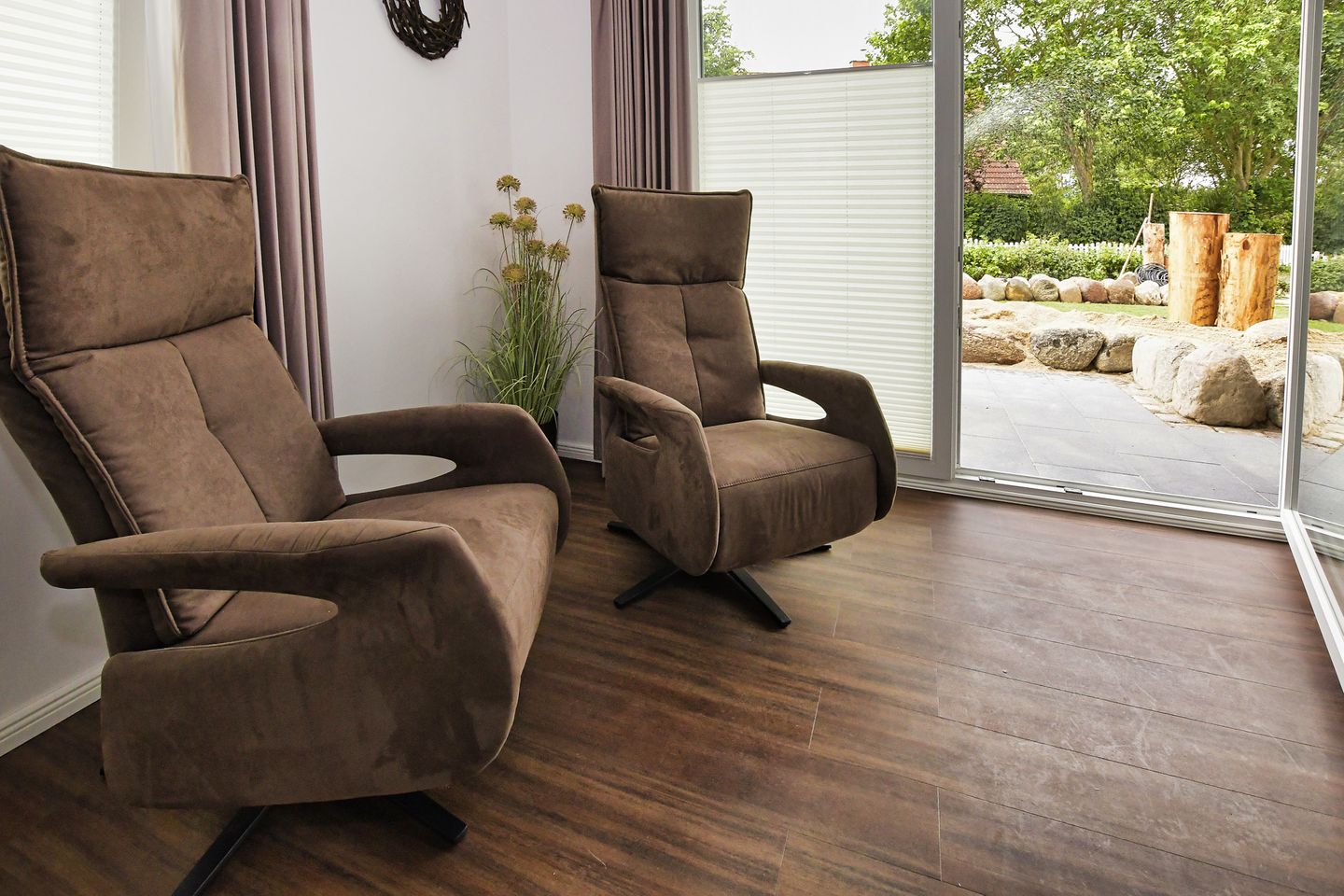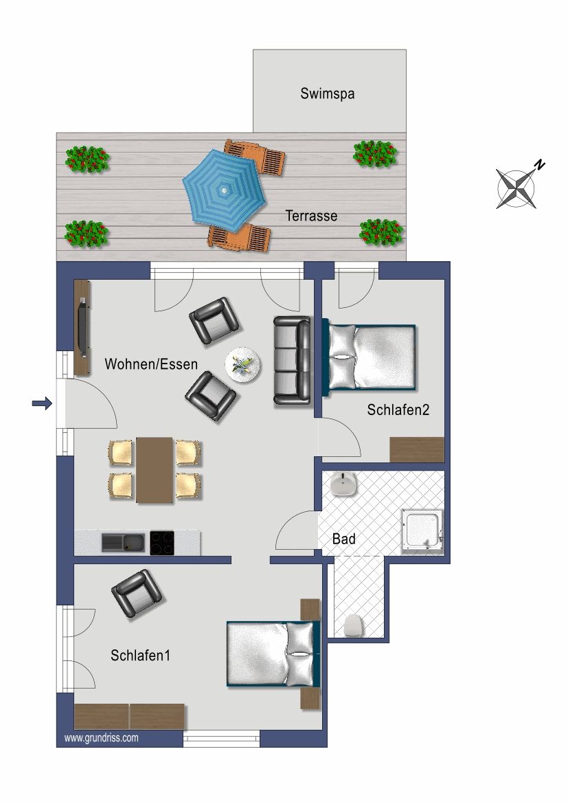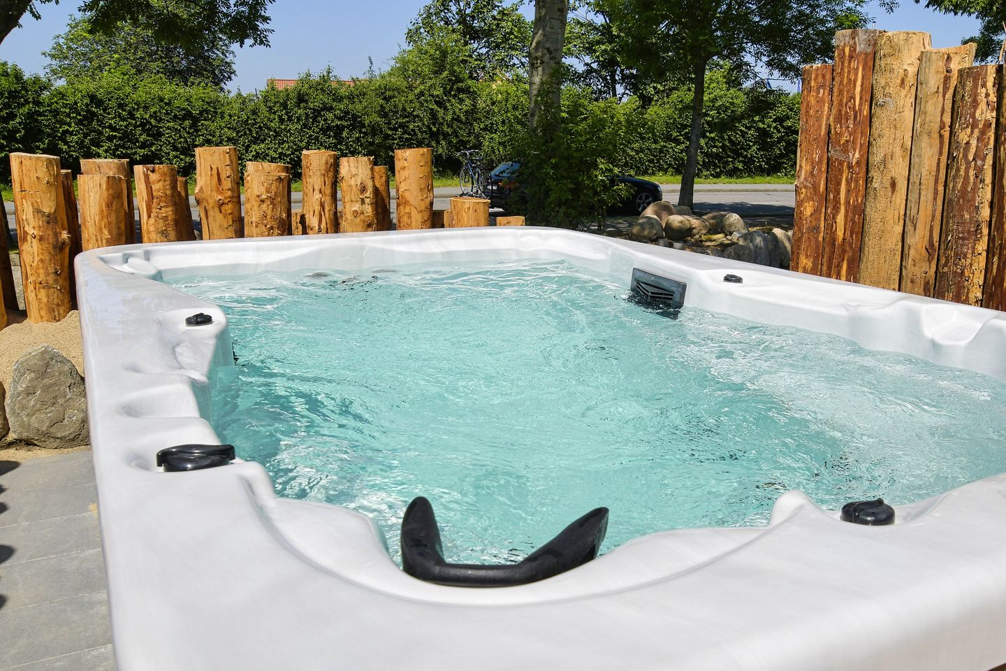 Eine große Terrasse mit Gartenmöbeln ermöglicht es Ihnen, den Tag mit einem Kaffee in der Sonne zu beginnen oder den Abend bei einem Glas Wein ausklingen zu lassen. Der Whirlpool im Außenbereich bietet eine integrierte Gegenstromanlage und steht Ihnen von April bis Mitte Oktober zur Verfügung. Besonders Kinder sind herzlich willkommen und können sich im Außenbereich austoben.