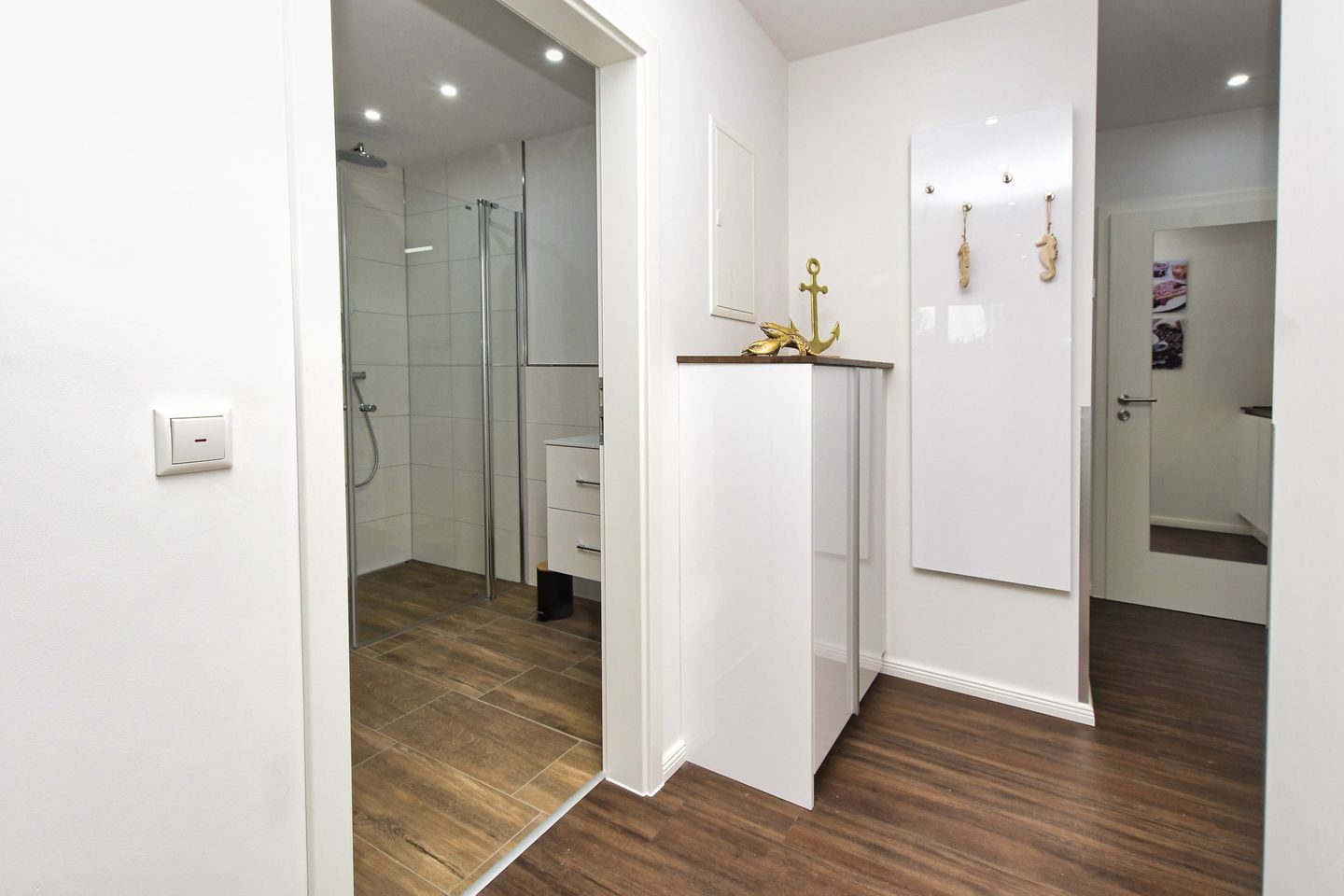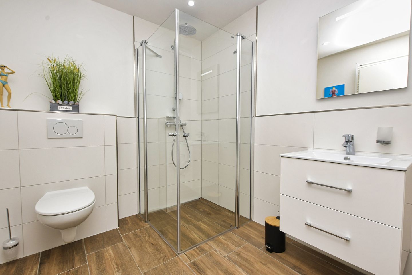 Ein weiteres Highlight der Wohnung ist das stilvolle Badezimmer mit einer bodengleichen Dusche, die Komfort und Barrierefreiheit vereint. Außerdem stehen Ihnen Gemeinschaftswaschmaschinen und Trockner zur Verfügung.