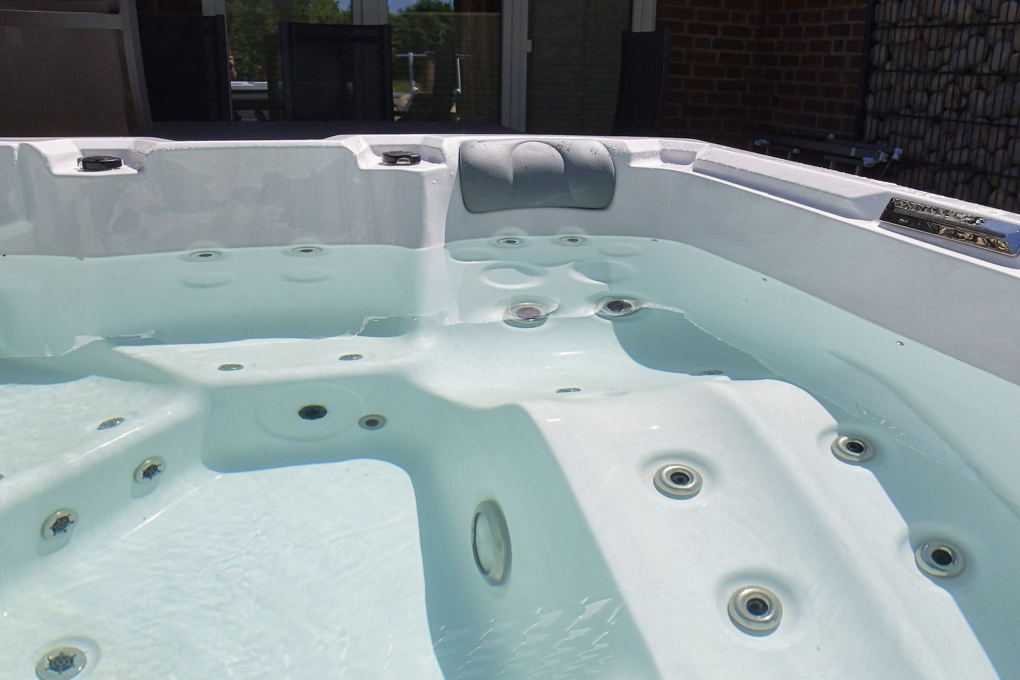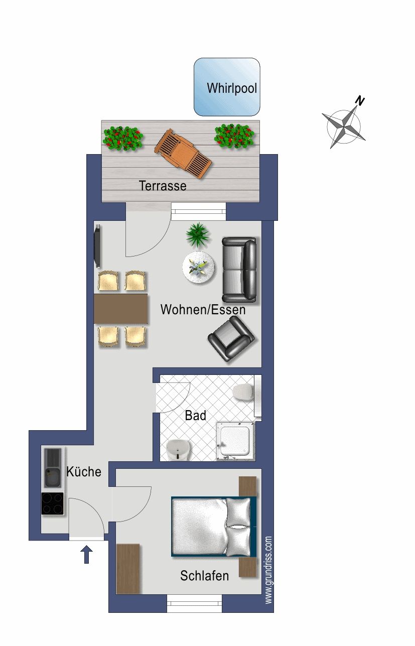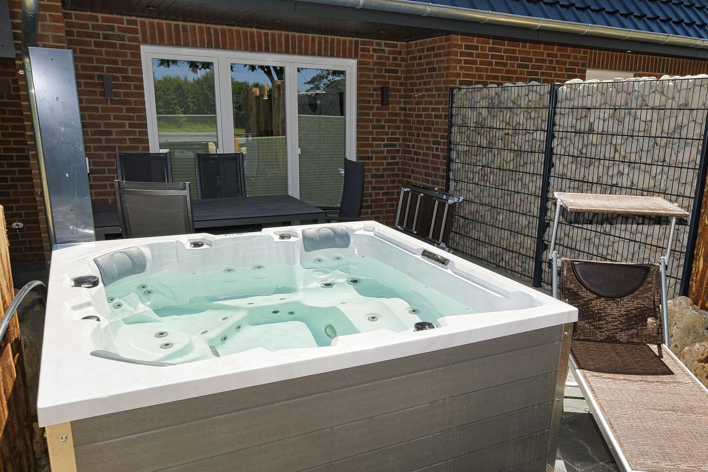 Genießen Sie entspannte Stunden auf der schönen Terrasse, die mit Gartenmöbeln ausgestattet ist und ideal ist, um die frische Meeresluft zu genießen oder einfach nur die Seele baumeln zu lassen. Der Whirlpool im Außenbereich steht Ihnen von April bis Mitte Oktober zur Verfügung. Ebenfalls gehört zu der Wohnung ein Privatparkplatz – ein echtes Plus, insbesondere in der Ferienzeit.