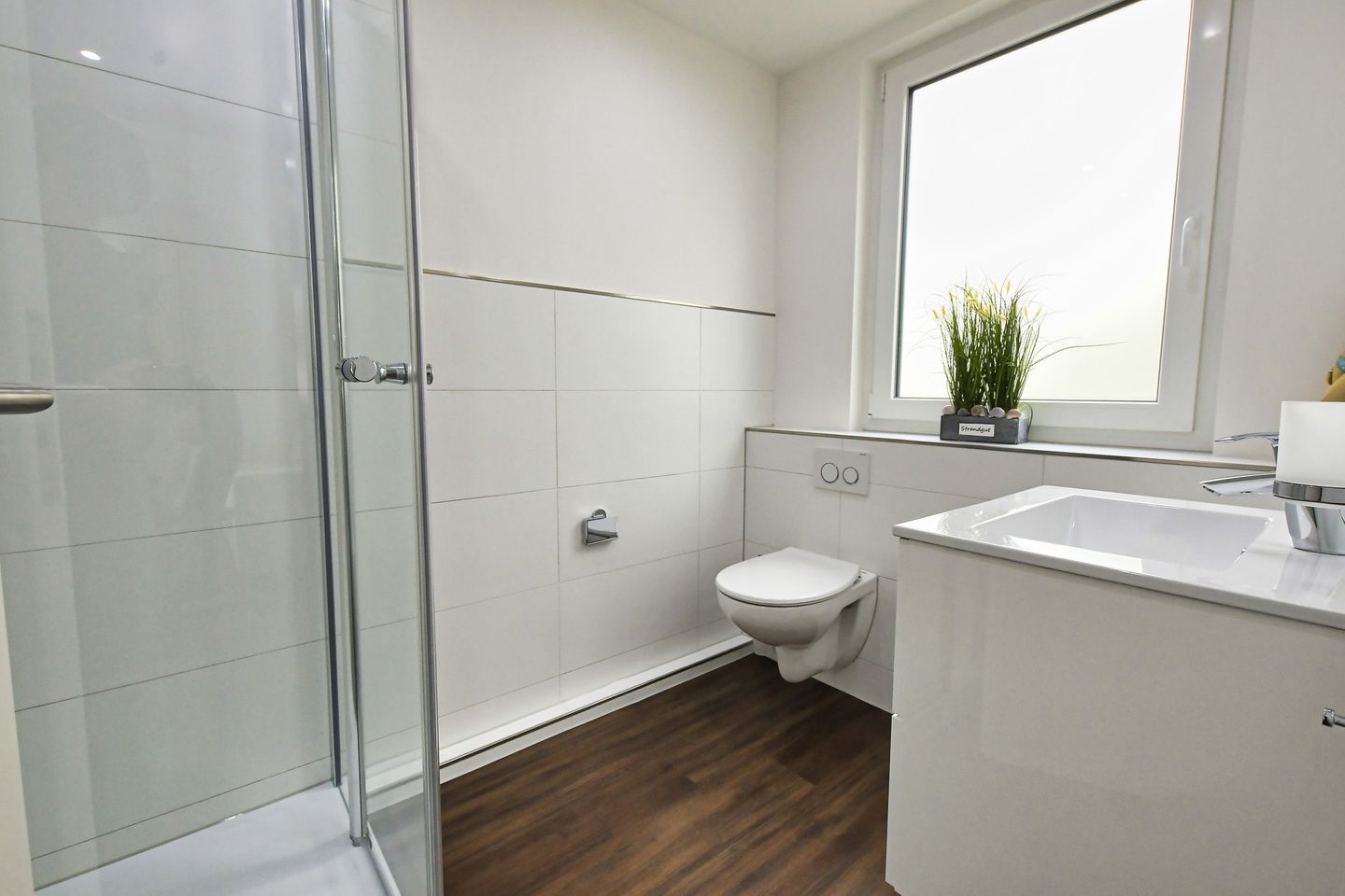 Das Badezimmer ist modern gestaltet und verfügt über eine bodengleiche Dusche, die den Einstieg erleichtert – ideal für Gäste jeden Alters. Hier finden Sie ebenfalls einen Haartrockner und ausreichend Stauraum, um Ihre persönlichen Utensilien unterzubringen.