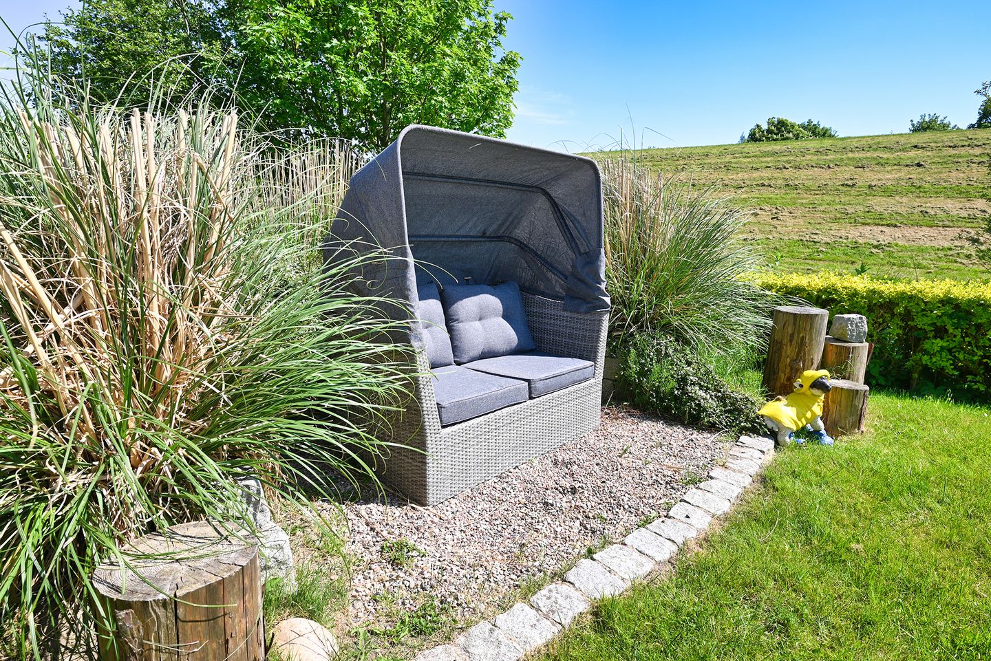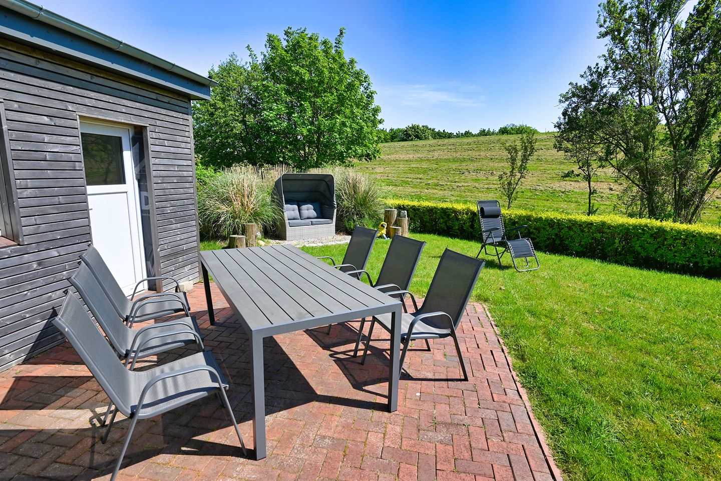 Das Highlight der Wohnung ist der Garten für entspannte Stunden. Sie bietet eine schöne Terrasse mit Gartenmöbeln und einer Strandmuschel.