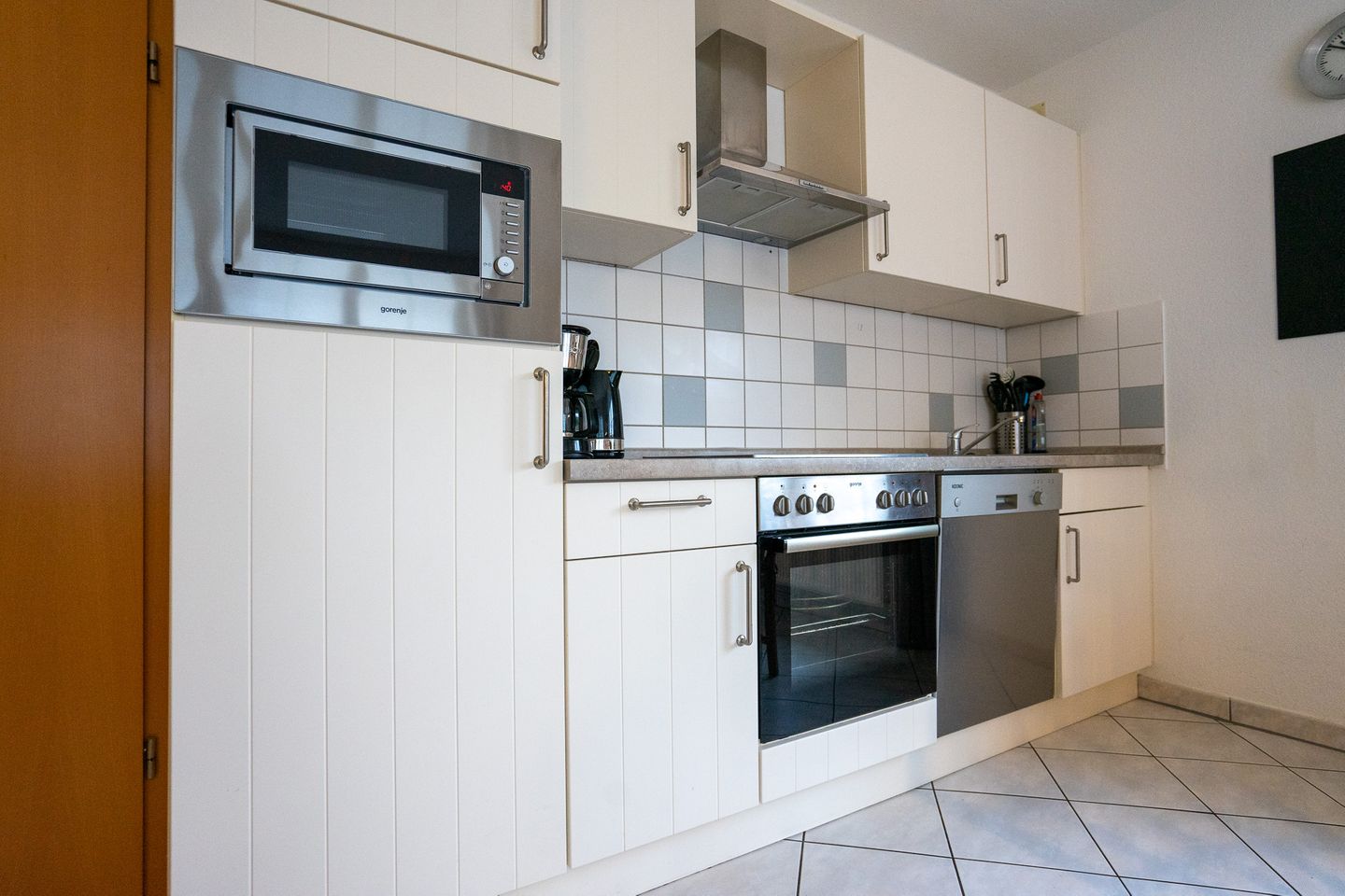Eine Waschmaschine steht zur alleinigen Benutzung bereit und wartet ebenso auf ihren Einsatz wie die Mikrowelle, der Geschirrspüler, der Backofen, die Kühl-/ Gefrierkombination und andere Elektrogeräte.