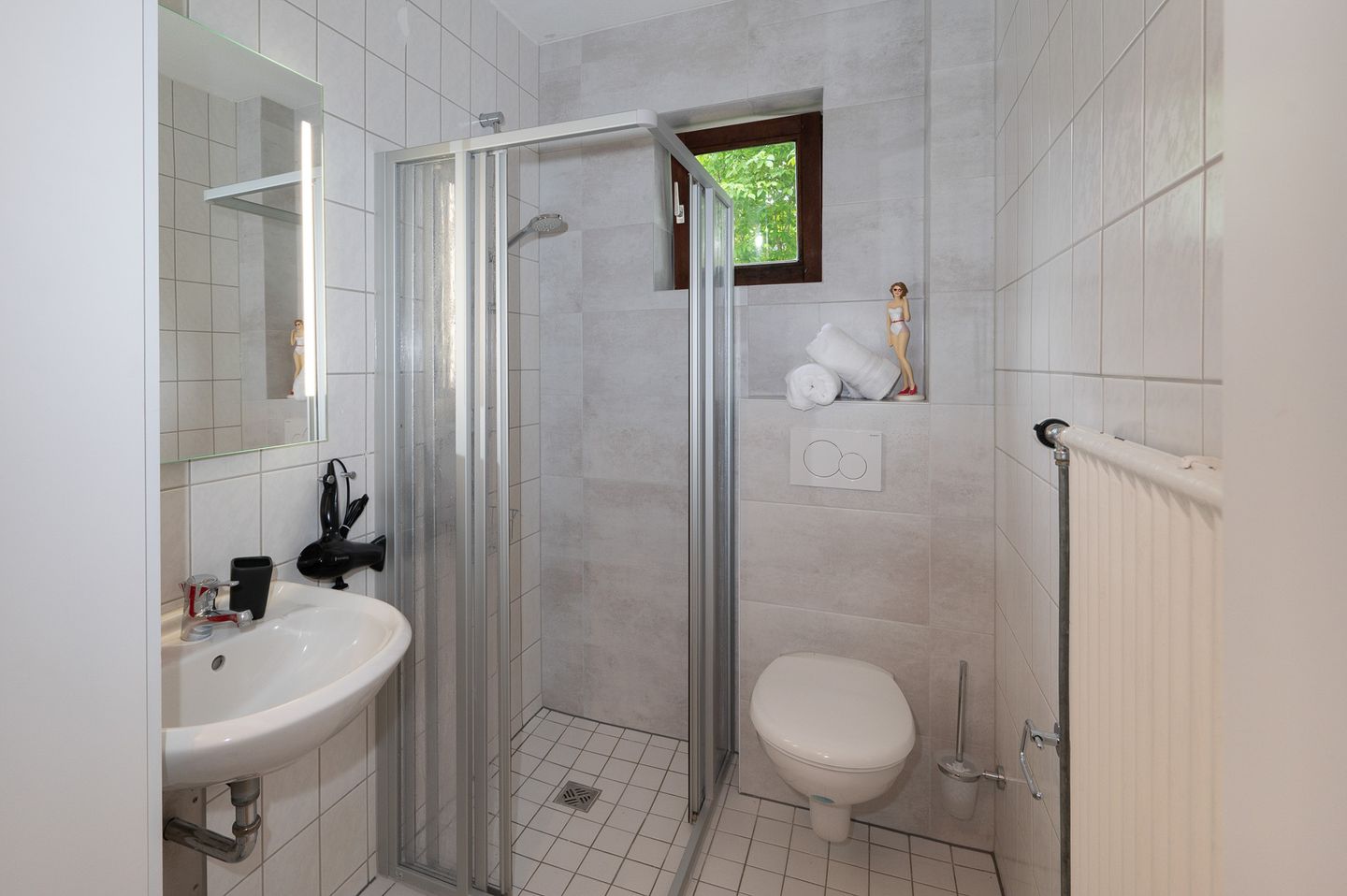 Ein weiterer Pluspunkt ist das moderne Badezimmer mit einer ebenerdigen Dusche, WC und Waschbecken. Hier finden Sie alles, was Sie benötigen, einschließlich eines Haartrockners.