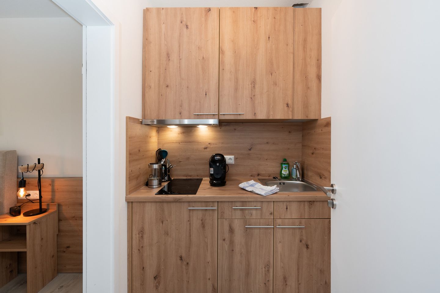 Dieses Apartment verfügt über einen gemütlichen Wohnbereich mit einem Essbereich, wo Sie entspannte Mahlzeiten zubereiten und genießen können. Die Kochnische ist komplett ausgestattet mit einem 2-Platten-Herd, Kühlschrank, Geschirr und Besteck sowie einer praktischen Espressomaschine für den perfekten Kaffee am Morgen. Der harmonische Raum ist ideal, um sich nach einem erlebnisreichen Tag zu erholen und neue Energie zu tanken.