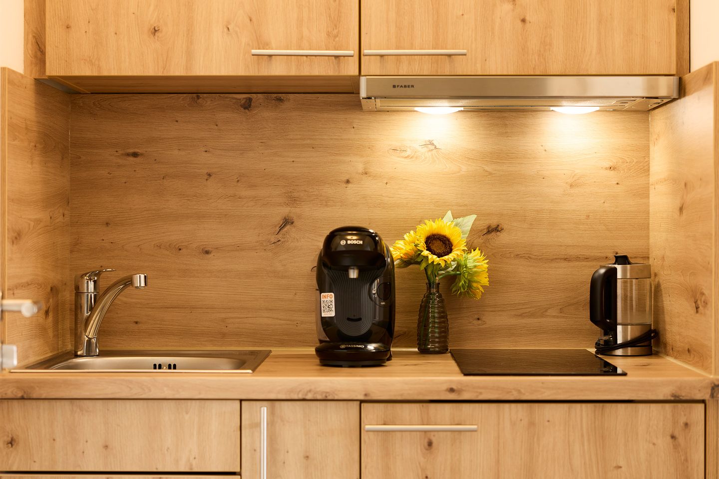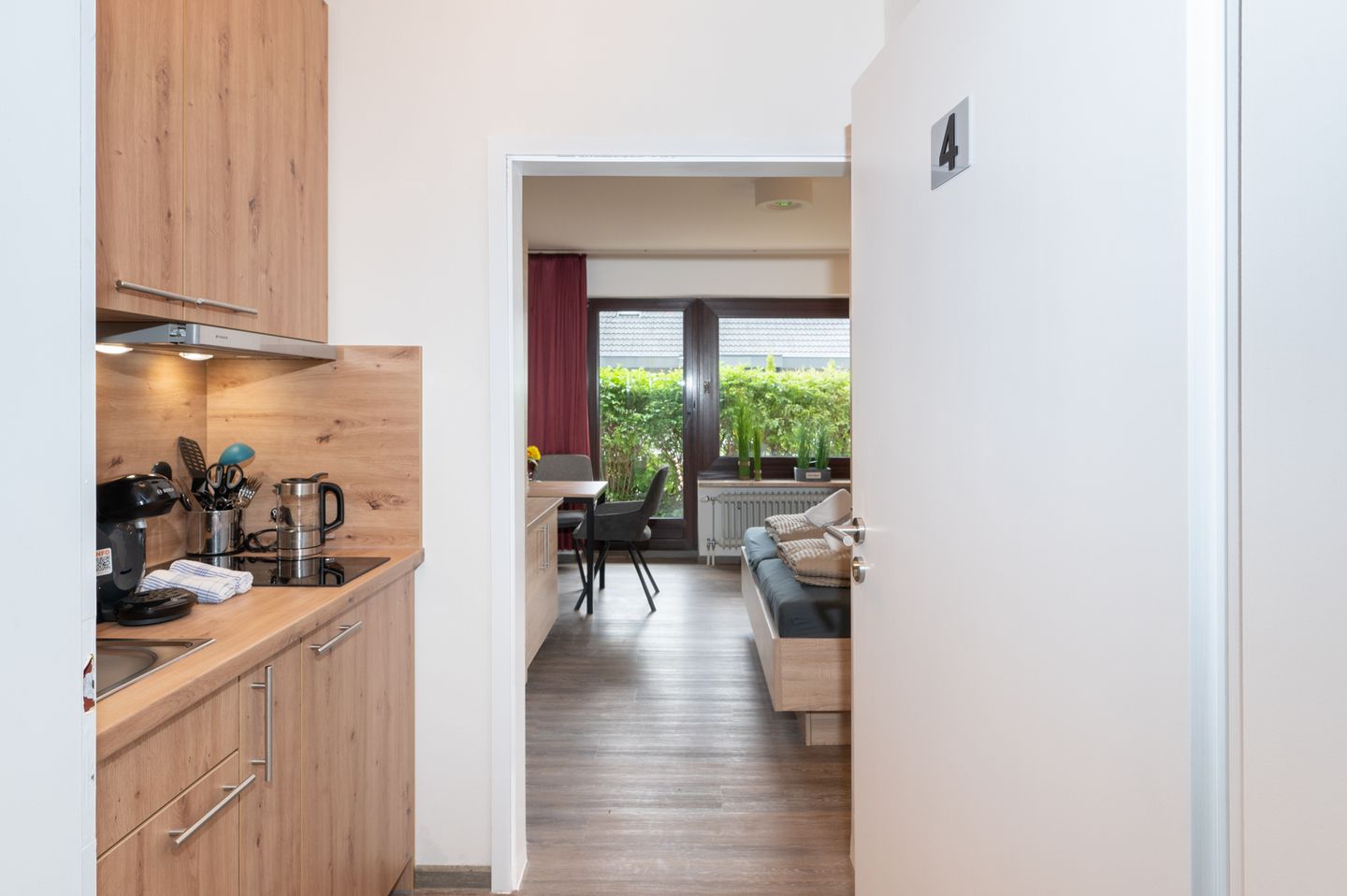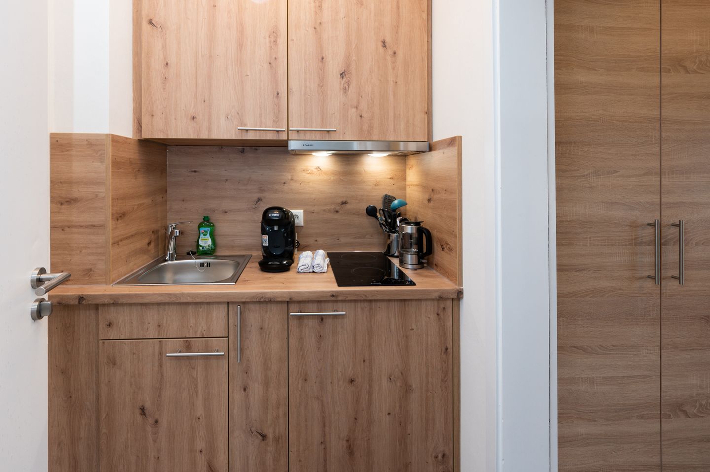 Die Wohnung befindet sich im Parterre, was einen unkomplizierten Zugang ermöglicht. Sie verfügt über ein gemütlichen Wohnraum, der mit einem Esstisch und einem komfortablen Schlafbereich ausgestattet ist. Die gut durchdachte Kochnische bietet Ihnen alles, was Sie für die Zubereitung einfacher Mahlzeiten benötigen, einschließlich eines 2-Platten-Herdes, eines Kühlschranks und einer modernen Espressomaschine – ideal, um Ihren Morgen mit einer leckeren Tasse Kaffee zu beginnen.