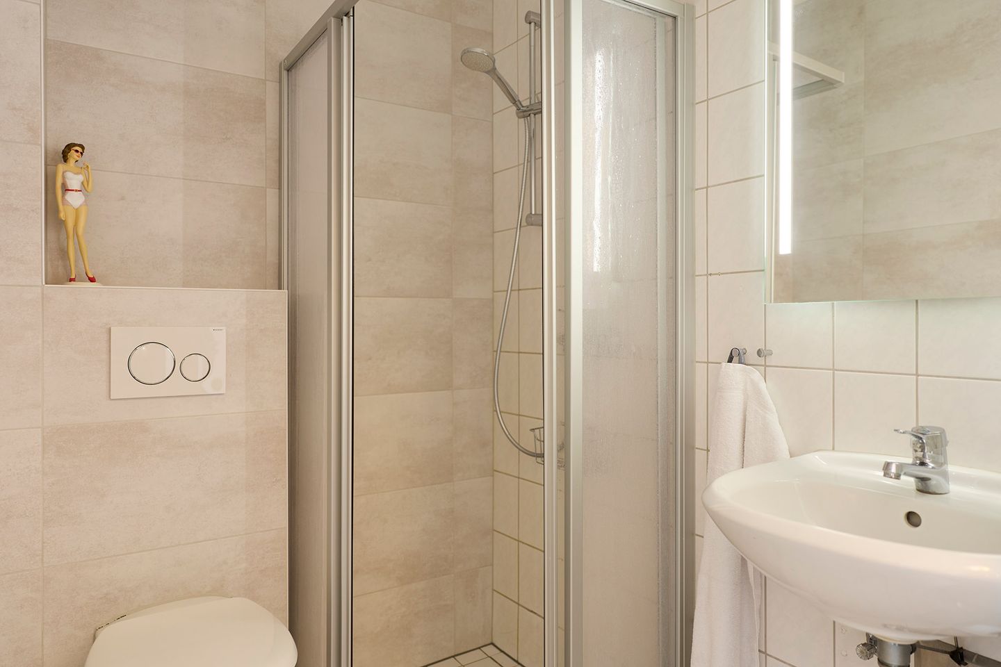 Der angelegte Essbereich lädt zu gemeinsamen Mahlzeiten ein, und nach einem aufregenden Tag an der Küste können Sie sich im Badezimmer mit bodengleicher Dusche, Haartrockne und Waschbecken erfrischen.