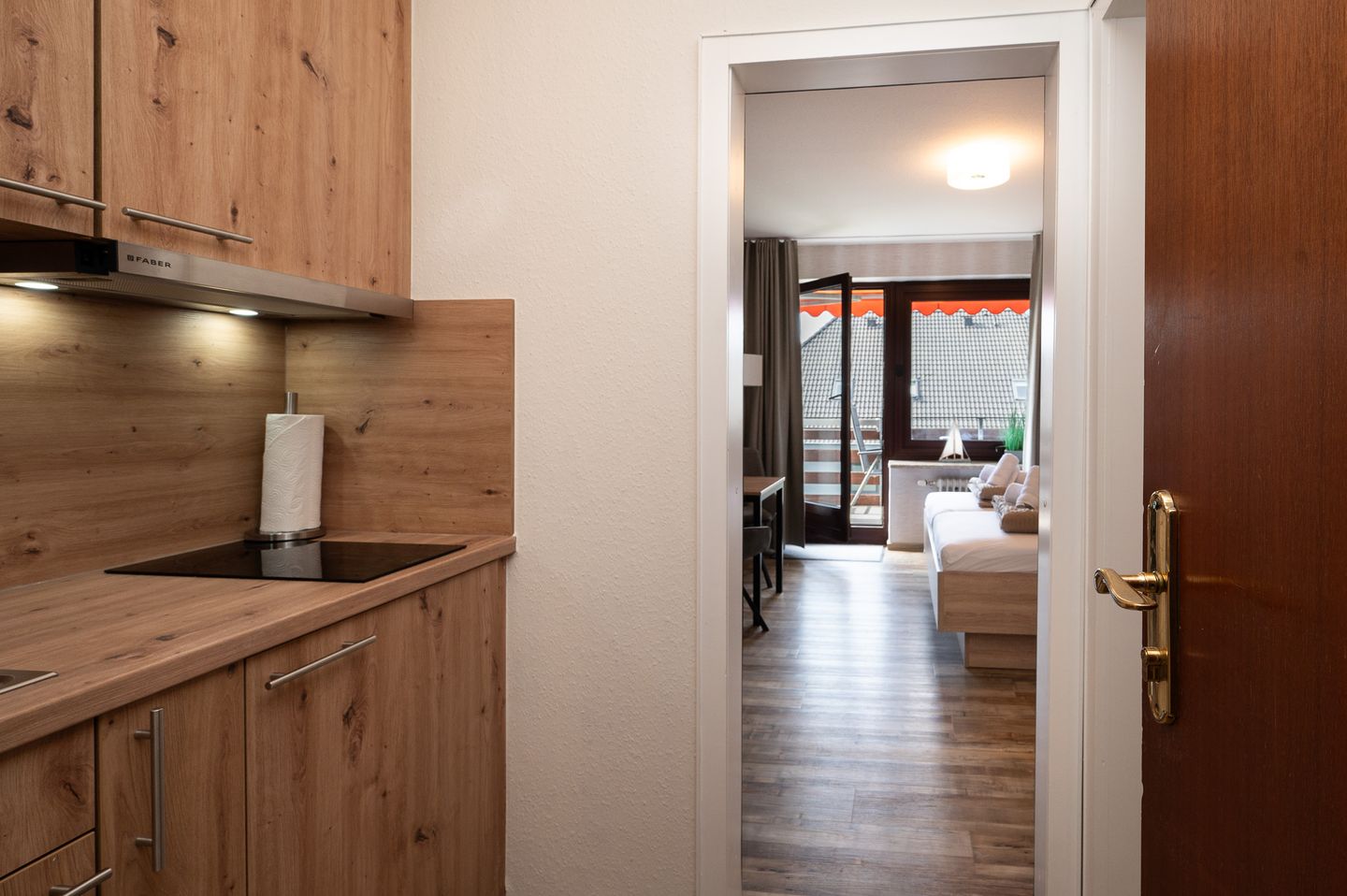 Küchenliebhaber werden sich über die Kochnische freuen, die mit allem ausgestattet ist, was Sie zum Zubereiten Ihrer Lieblingsgerichte benötigen. Ob Kühlschrank, Geschirr, Besteck oder eine moderne Tassimo Espressomaschine – hier bleibt kein Wunsch unerfüllt. Der Esstisch lädt ein, gemeinsame Mahlzeiten zu genießen und neue Erinnerungen zu schaffen.