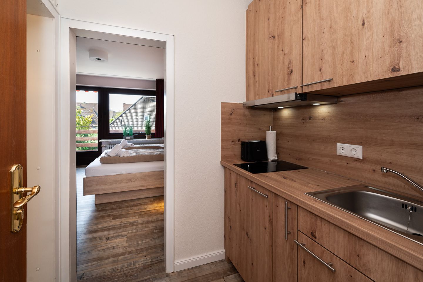 Ausstattung: Die Ferienunterkunft verfügt über ein gemütliches Zimmer mit Schlafmöglichkeiten für zwei Personen. Der helle Wohn- und Schlafbereich ist geschmackvoll eingerichtet und bietet einen Esstisch sowie eine Sitzecke, die zum Entspannen einlädt. Eine Kochnische mit Kühlschrank, Geschirr, Besteck und einer modernen Espressomaschine sorgt dafür, dass Sie sich auch selbst bewirten können, um die ersten Sonnenstrahlen des Tages mit einer selbstgemachten Tasse Kaffee zu genießen. Ein Balkon lädt zusätzlich dazu ein, den Blick in die Umgebung zu genießen.