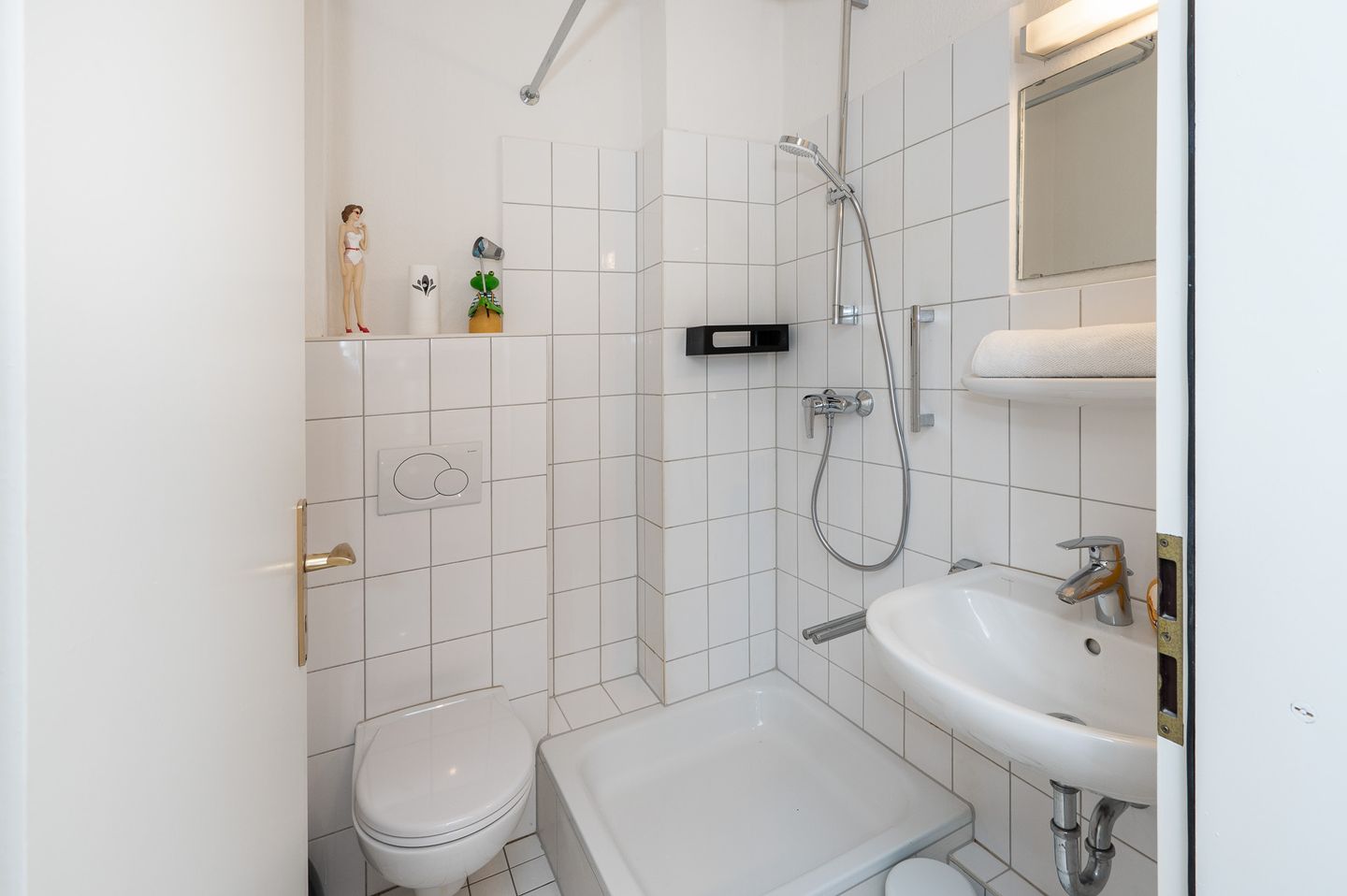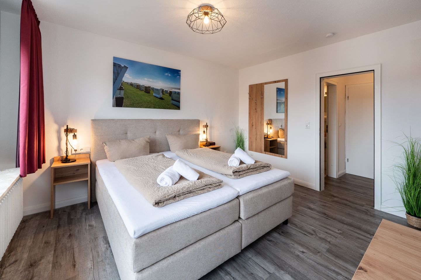 Das Schlafzimmer bietet Platz für bis zu zwei Personen und sorgt für eine erholsame Nachtruhe. Ein modernes Badezimmer mit Dusche und Wanne, Haartrockner sowie einem großen Ganzkörperspiegel lässt keine Wünsche offen und rundet das Wohlfühl-Erlebnis ab.